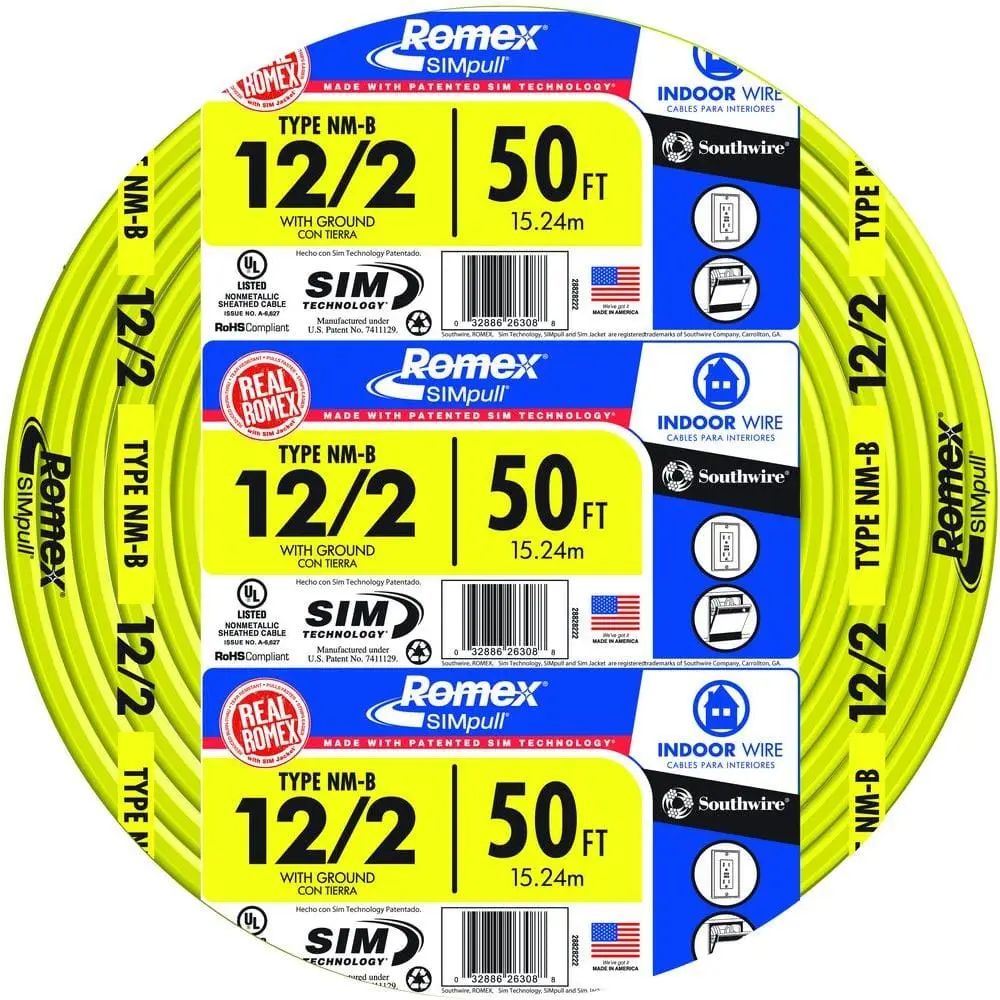 Southwire Romex Brand SIMpull NM-B (nonmetallic-sheathed) cable is designed for both exposed and concealed installations in dry locations, with a temperature rating not exceeding 90°C (ampacity limited to that of 60°C conductors). It is primarily used for residential wiring, such as branch circuits for outlets, switches, and other loads. This NM-B cable can be run in air voids of masonry block or tile walls, provided these walls are free from excessive moisture or dampness. It has a voltage rating of 600 volts.