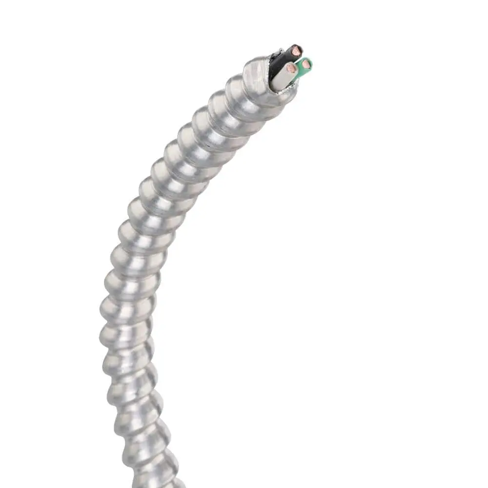 Southwire Armorlite Type MC Cable is constructed with soft-drawn copper conductors, Type THHN/THWN rated at 90°C for dry locations, available in sizes from 14 AWG to 2 AWG, and includes a green insulated grounding conductor. The conductors are bundled together and wrapped with binder tape, which features the print legend. An aluminum interlocking armor is applied over the assembly for added protection.