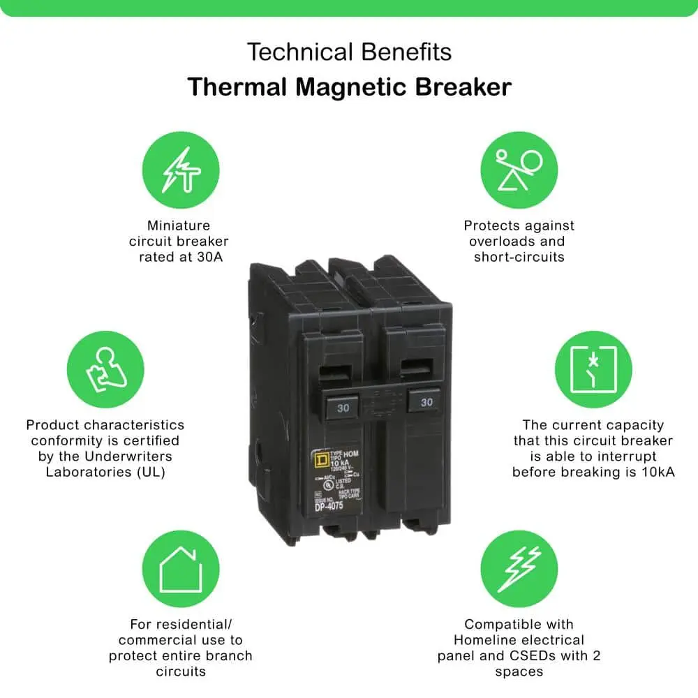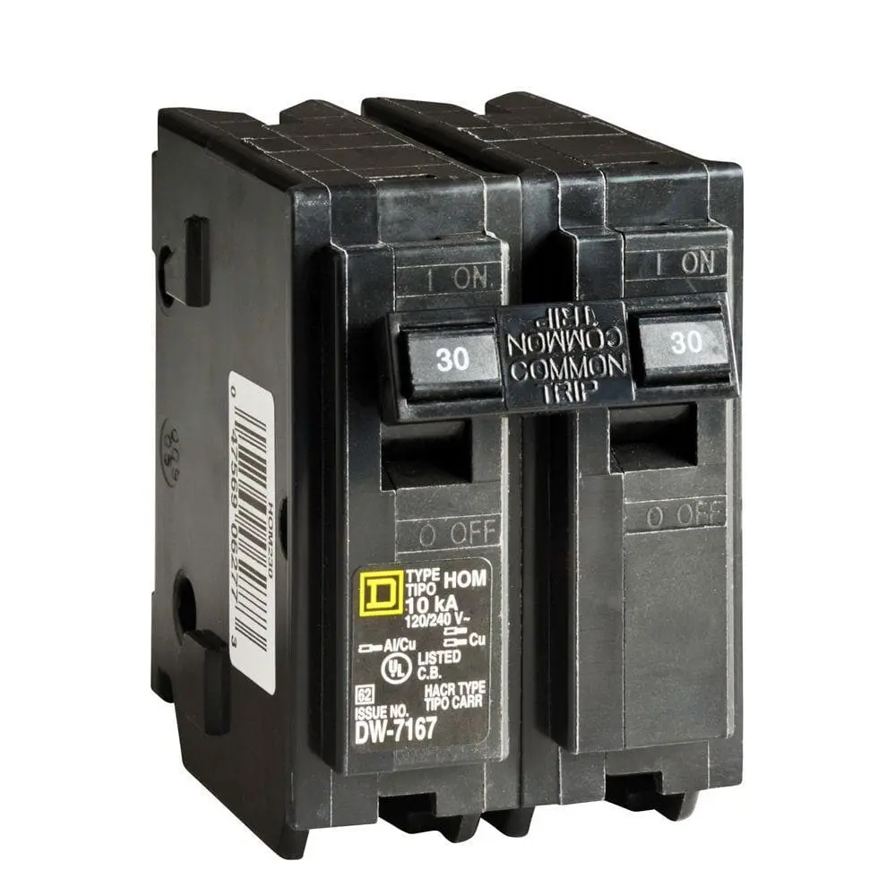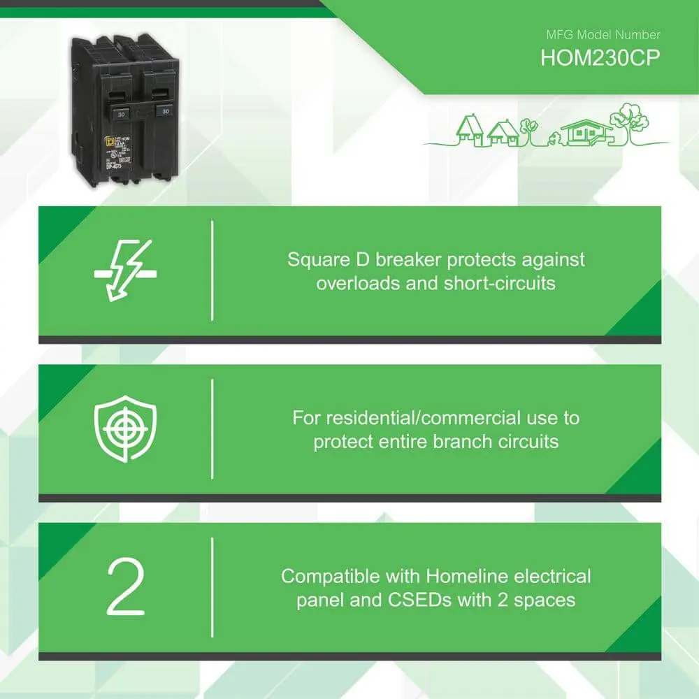 The Square D Homeline 30 Amp Two-Pole Circuit Breaker offers reliable protection against overloads and short circuits for your electrical system. Designed for use with Homeline load centers and CSED devices, this breaker is UL-listed and ANSI-certified. It is rated for 120/240 VAC and can handle up to 10,000 AIR. With the trusted quality of Square D, Homeline circuit breakers provide excellent value and are engineered specifically for residential use, offering everything needed for efficient electricity distribution throughout your home.