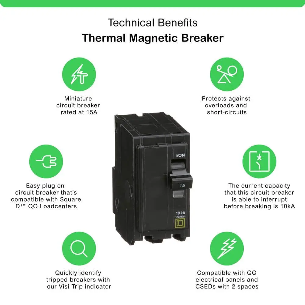 The QO 15 Amp Double-Pole Plug-On Circuit Breaker is designed for use with Square D QO load centers, QO enclosures, CSED devices, and NQOD panel boards. Featuring a thermal-magnetic tripping system, it offers protection against both electrical surges and overloads. The Visi-Trip indicator makes it easy to identify which breaker has tripped, ensuring quick troubleshooting.