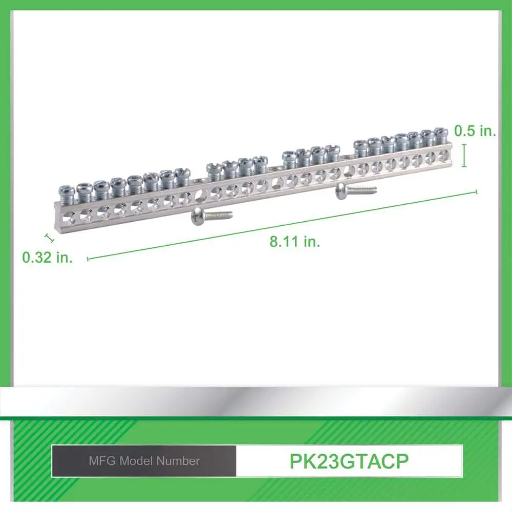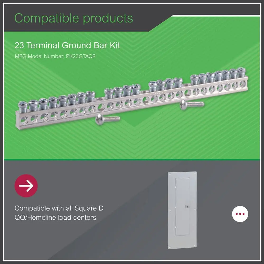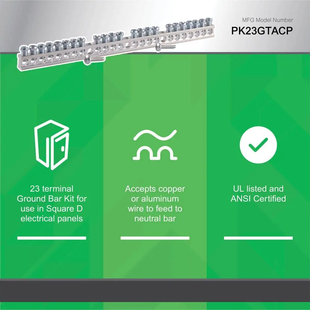 The Square D by Schneider Electric Ground Bar Kit is an essential accessory for residential or commercial electrical load centers. This aluminum 23-terminal ground bar kit is designed for use with Square D load centers, CSED devices, and NQOD and NF panel boards. Each terminal accommodates a variety of wire sizes, including (1) #14–#4 copper or (1) #12–#4 aluminum, or (2) #14–#12 copper or (2) #12–#10 aluminum.