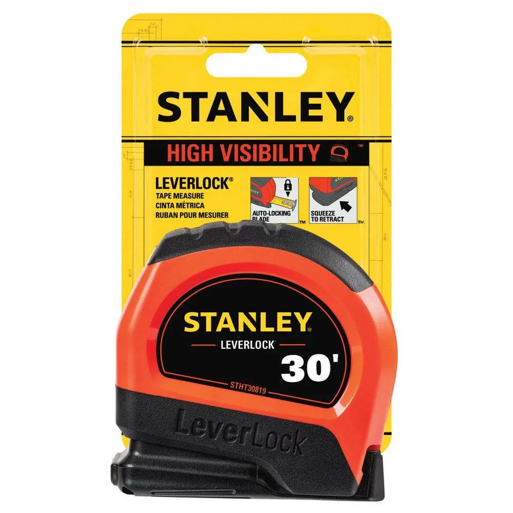 The Stanley 30 ft. LeverLock High Visibility Tape Measure offers a 30 ft. length, making it ideal for a variety of measuring tasks. Featuring a LeverLock mechanism, it ensures secure blade locking for precise measurements. The high-visibility blade is easy to read in different lighting conditions, providing added convenience. With its durable design, this tape measure is built to withstand tough job site conditions. Its compact size allows for easy storage and portability, making it a reliable tool for both professionals and DIY enthusiasts