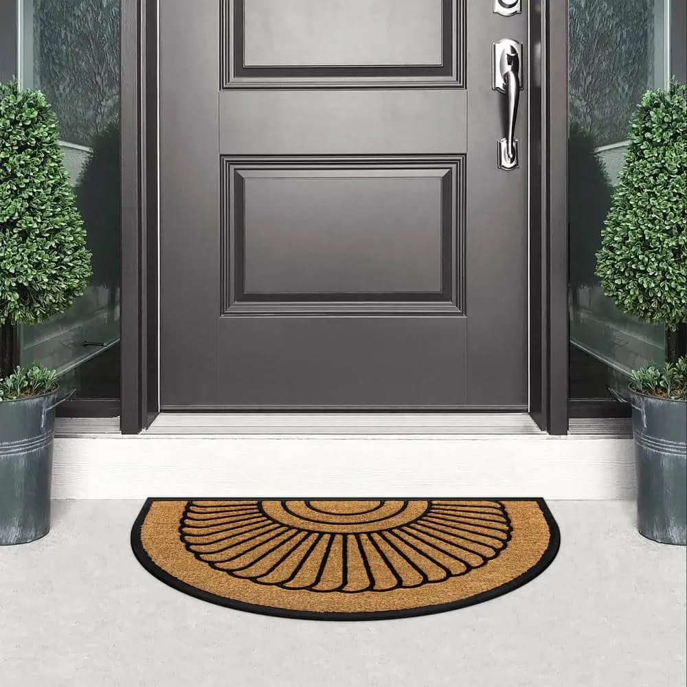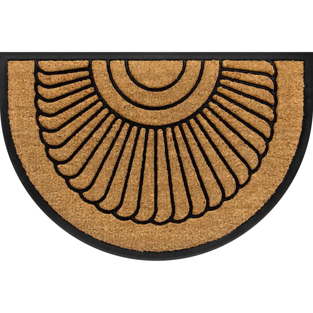 The StyleWell Sunburst Natural Beige 24 in. x 36 in. Half Round Coir Outdoor Mat adds a unique touch to your entryway with its half-round shape and attractive sunburst pattern. Made from durable coir fibers, this mat effectively traps dirt and debris, keeping your outdoor area clean. The natural beige color complements various outdoor settings, while the non-slip backing ensures it stays securely in place for added safety. Eco-friendly and easy to clean, simply shake or vacuum to maintain its fresh appearance