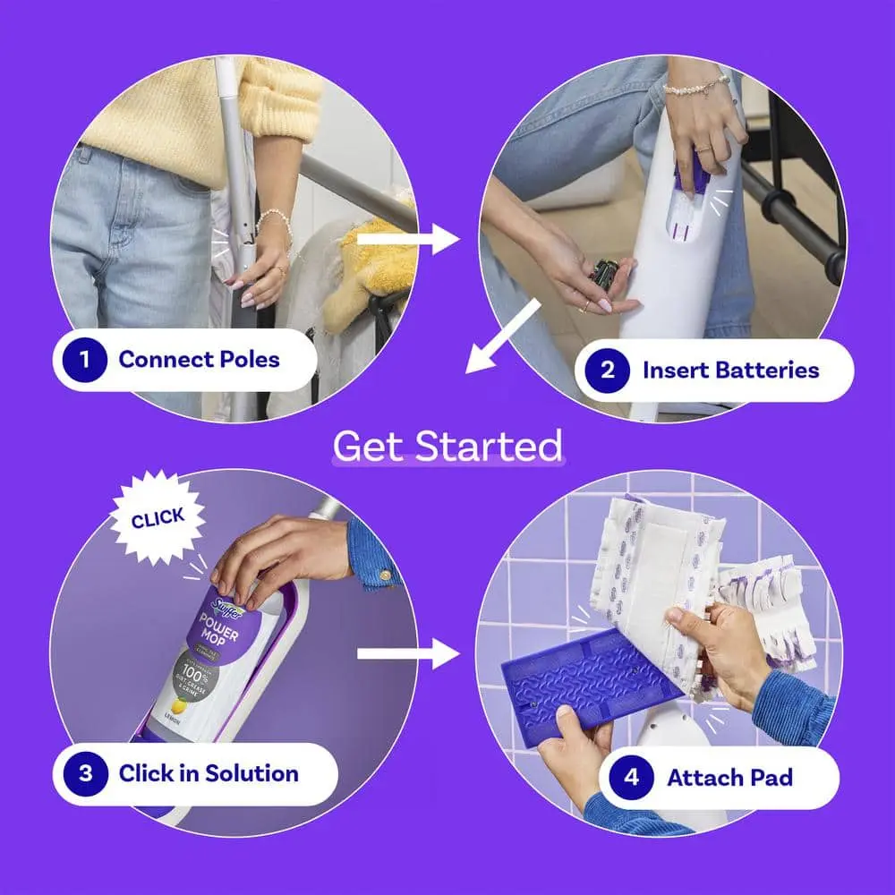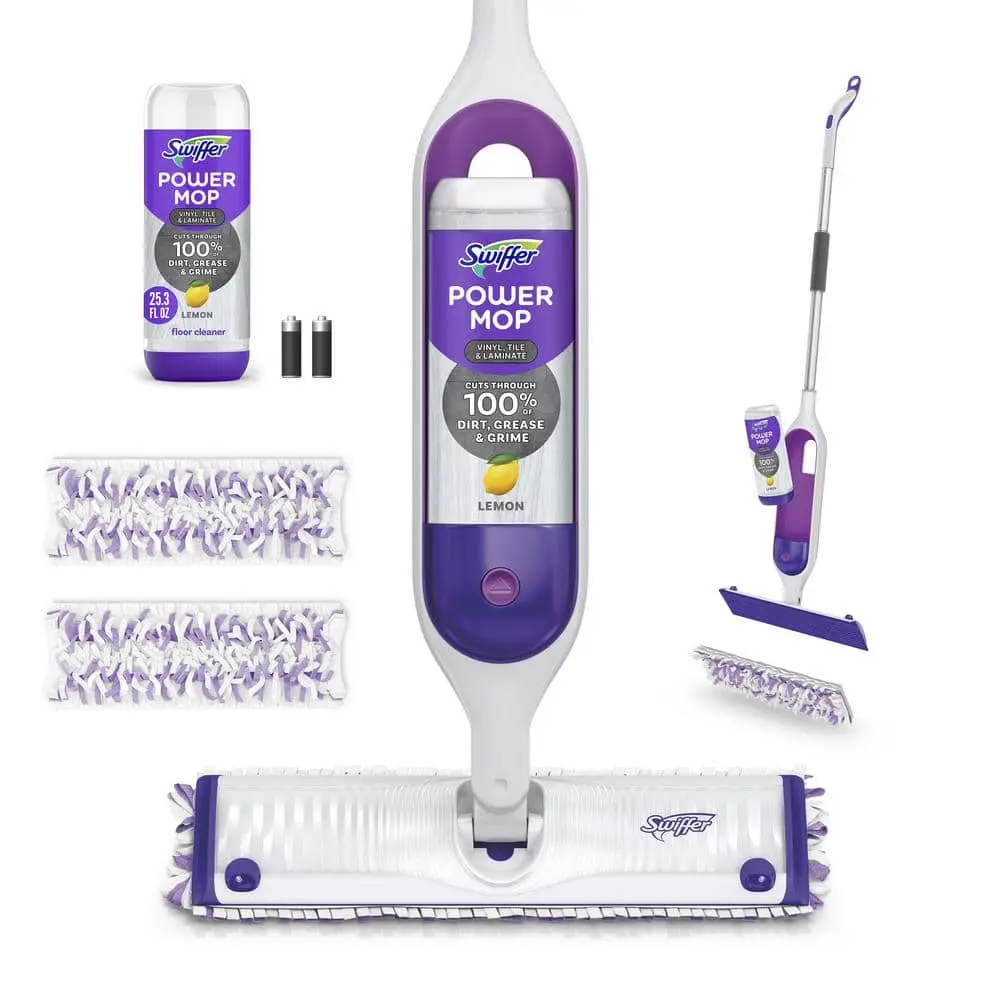 The Swiffer Power Mop Vinyl, Tile, and Laminate Floor Spray Mop delivers a thorough clean across all floors in your home. Featuring a fine mist spray formula, this all-in-one mopping system ensures even solution coverage, effectively cleaning without causing warping or cupping. The powerful cleaning solution lifts and loosens dirt, which is then captured and locked away by the Power Mop pad, leaving your floors spotless.