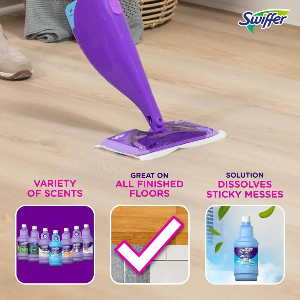 Swiffer WetJet Multi-Surface Floor Cleaner is a ready-to-use cleaning solution designed specifically for the Swiffer WetJet all-in-one spray mop. Its safe, fast-drying formula effectively dissolves dirt and stubborn, sticky messes, bringing out the natural beauty of your floors. Safe for wood, but avoid using on unfinished, oiled, or waxed wooden boards, non-sealed tiles, or carpeted floors as they may be water-sensitive.