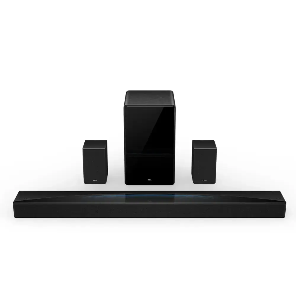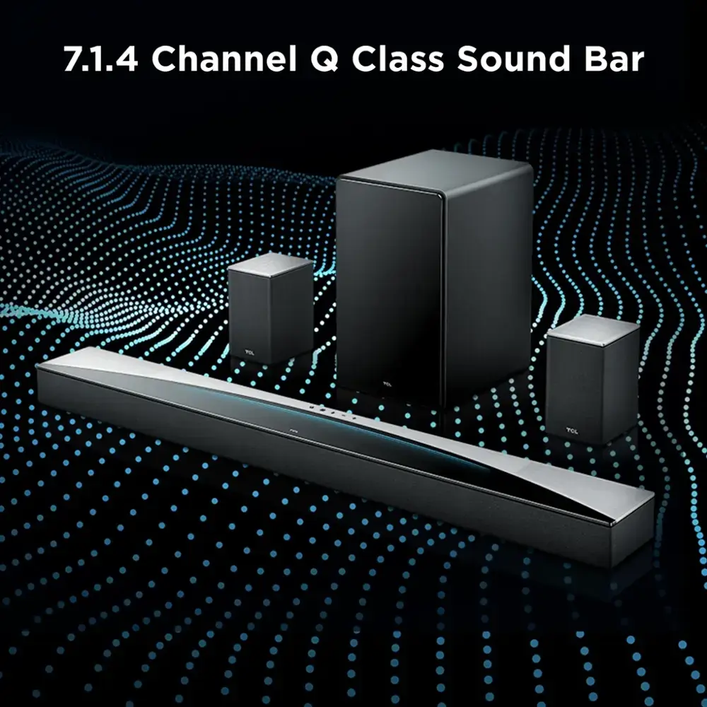 The TCL Q85H Q Class 7.1.4 Channel Soundbar brings a premium audio experience with Dolby Atmos support, delivering immersive surround sound. The wireless subwoofer provides deep, rich bass, while the wireless surround speakers enhance the audio for a full cinematic experience. With high-quality audio, it ensures clear and detailed sound that elevates your entertainment. The sleek black design adds a modern touch to any setup, and the easy setup ensures a hassle-free installation process for immediate enjoyment