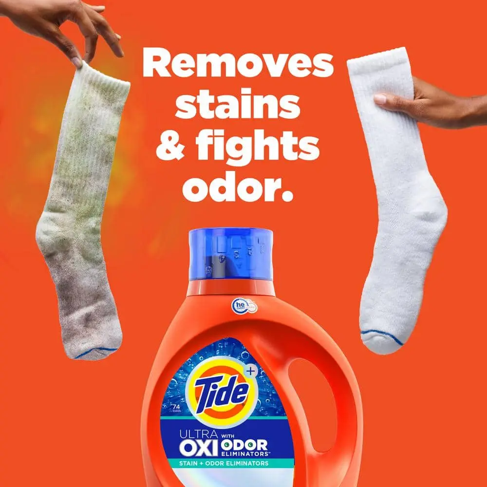 Tide Ultra Oxi with Odor Eliminators liquid laundry detergent offers two key signs that your clothes are clean: they look great and smell fresh. This one solution gives you both benefits, making it the ideal choice for busy families who need reliable results every time. Whether your laundry load is large or heavily soiled, Tide Ultra Oxi HE detergent handles stains without the need for pre-treating or scrubbing, simplifying your laundry routine. Trust America’s #1 detergent to tackle tough stains with powerful performance. Voted the most trusted laundry brand by American shoppers in the 2021 BrandSpark American Trust Study.