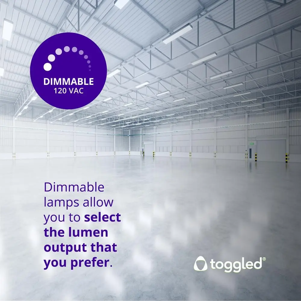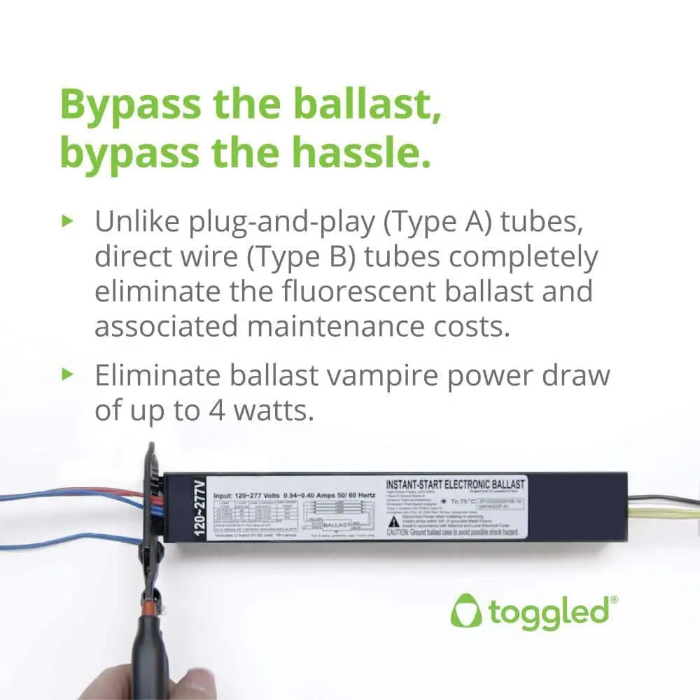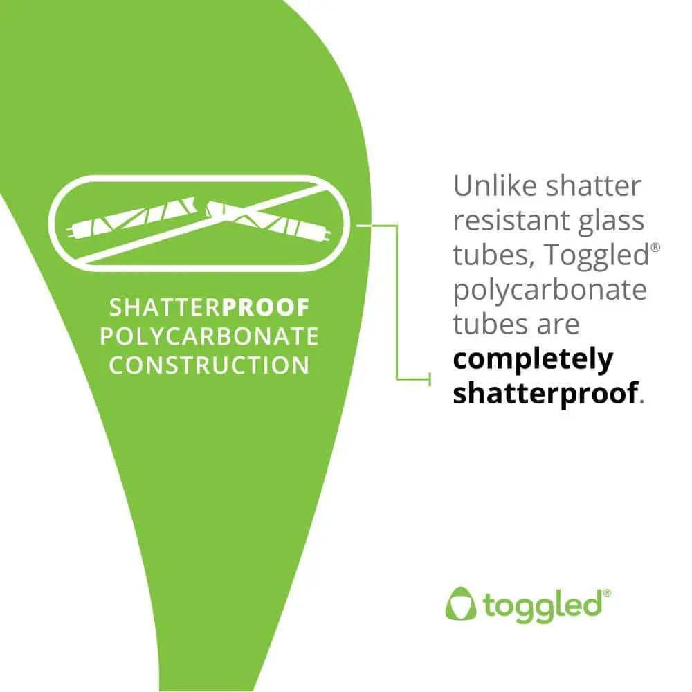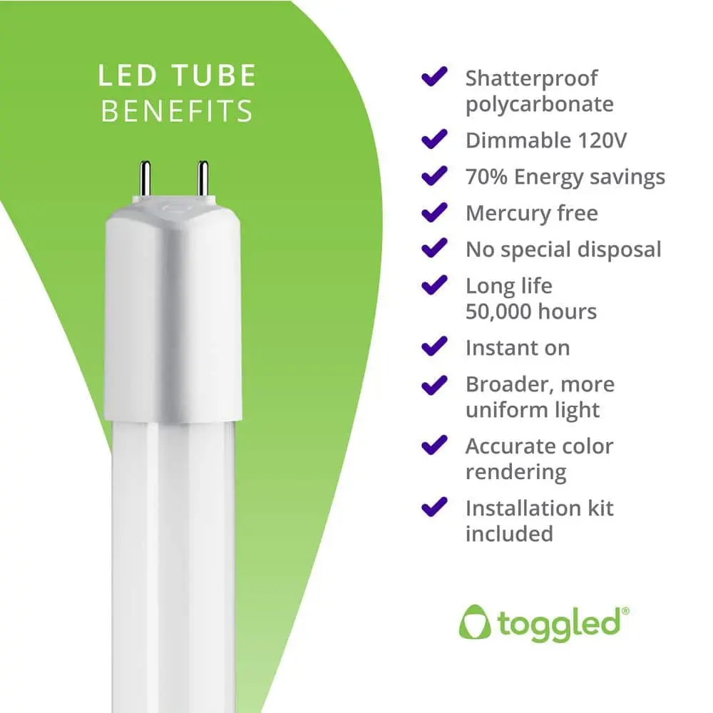 The Toggled direct-wire/Type B LED tubes (2-pack; 6500K/Daylight Deluxe) are an energy-efficient solution designed to replace T8 and T12 fluorescent tubes. These dimmable LED tubes are UL Classified, FCC compliant, and offer 16 Watts of energy usage while delivering 2,000 lumens of brightness. With a long lifespan of 50,000 hours , they are a reliable option for enhancing your facility's lighting. By eliminating ballast systems, these LED tubes help reduce energy costs, improve light quality, and are mercury-free. Installation requires rewiring around ballast systems to non-shunted lamp holders, and it typically takes only about 5 minutes. Removing the ballast not only saves 4-6 Watts but also eliminates the need for future ballast replacements. The installation kit includes pre-wired lamp holders for added convenience.