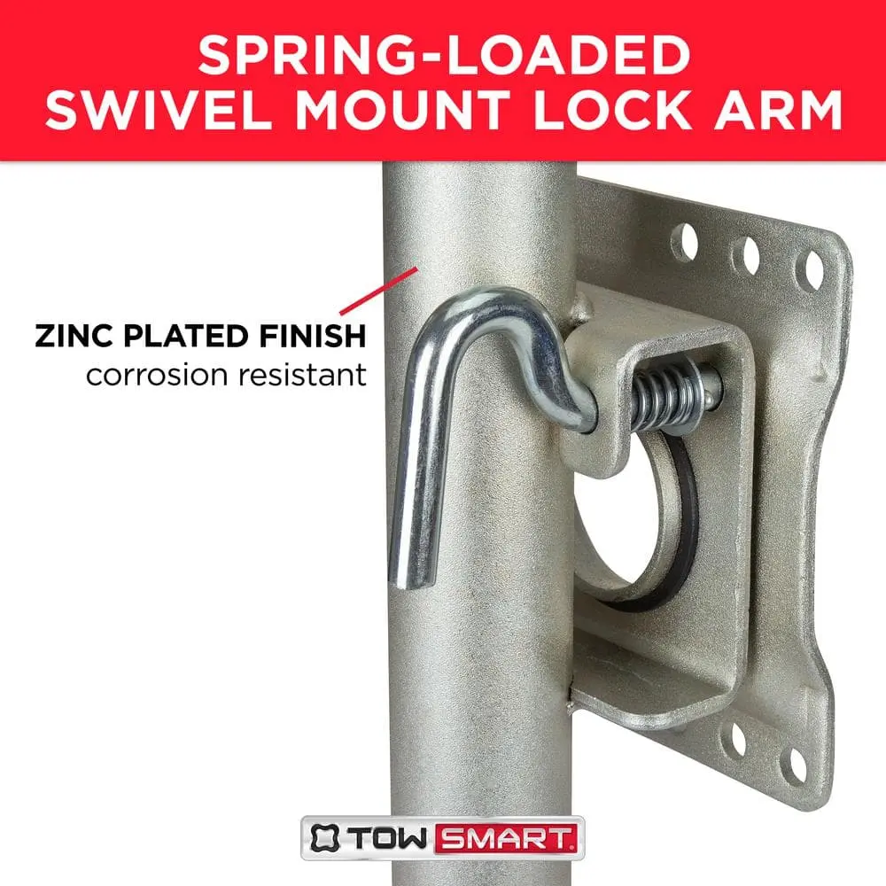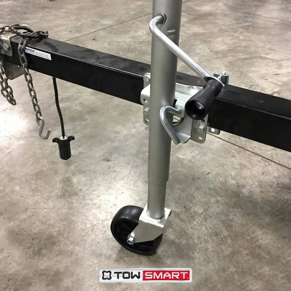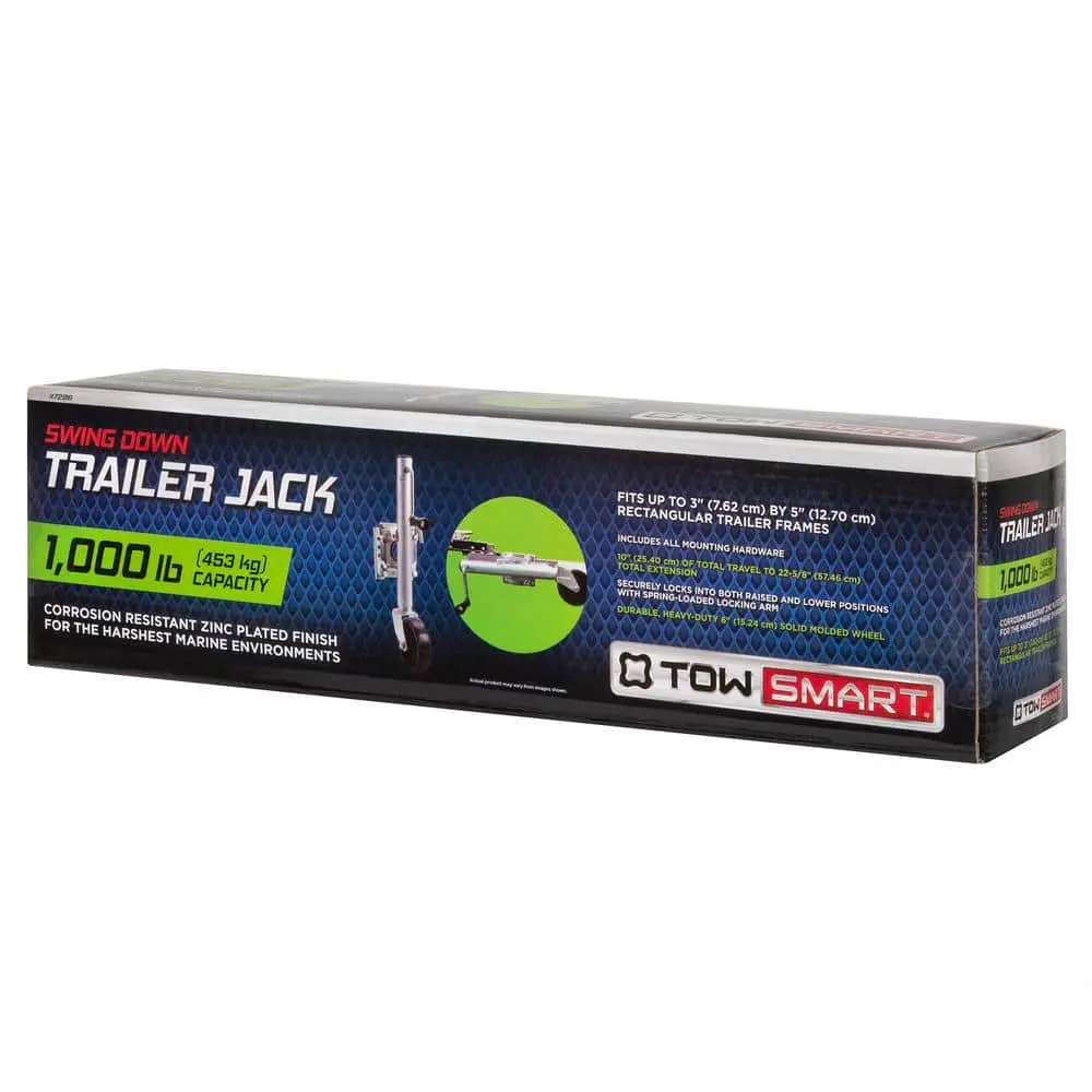 The TowSmart Swivel Swing-Down Trailer Jack is designed with a corrosion-resistant zinc-plated finish, making it ideal for marine and other harsh environments. It securely locks into raised and lowered positions using a spring-loaded locking arm, ensuring reliable support. The jack also features a durable 6-inch heavy-duty molded wheel and comes with all necessary mounting hardware for easy installation.