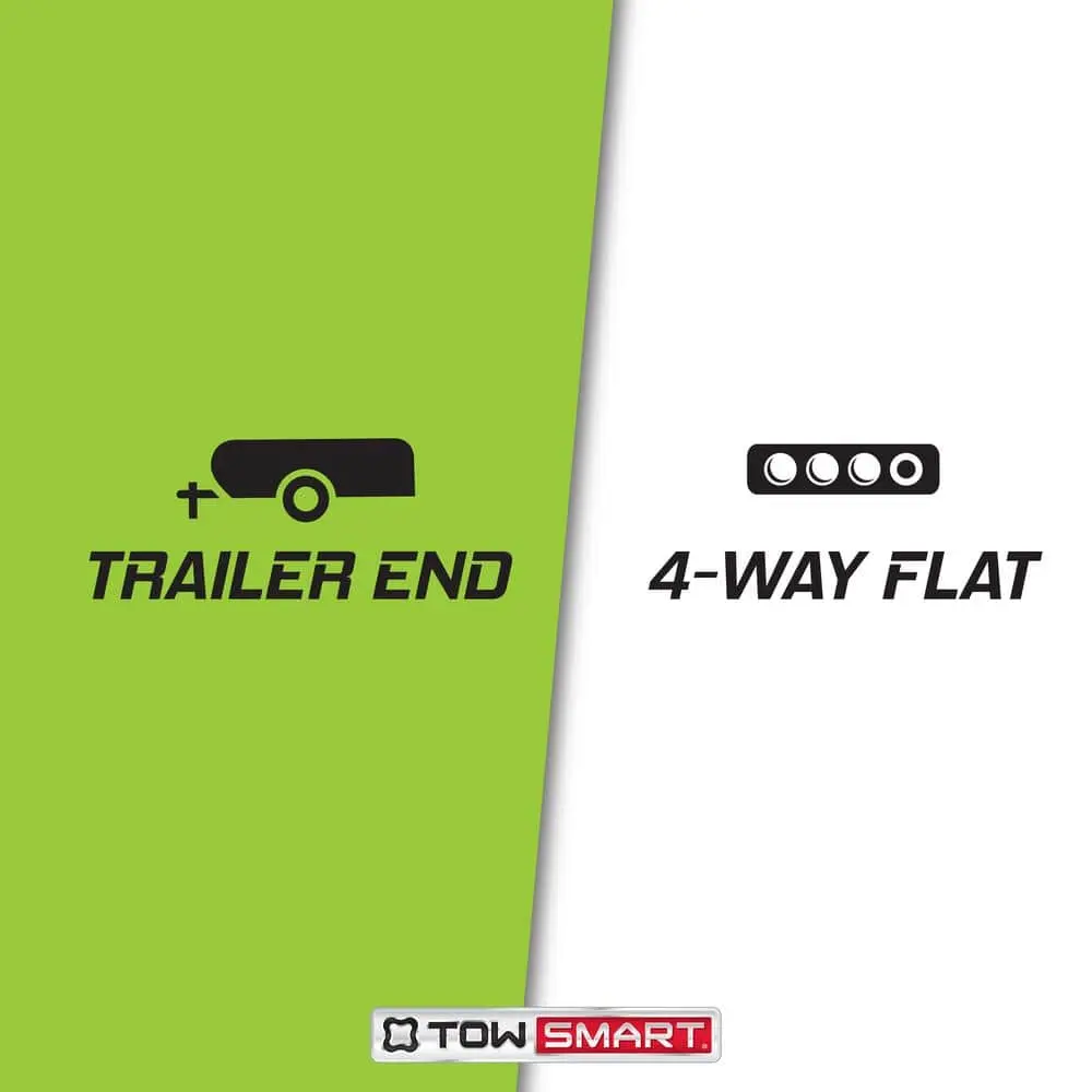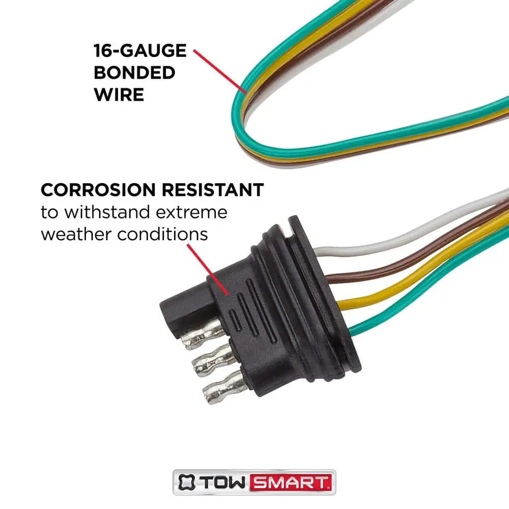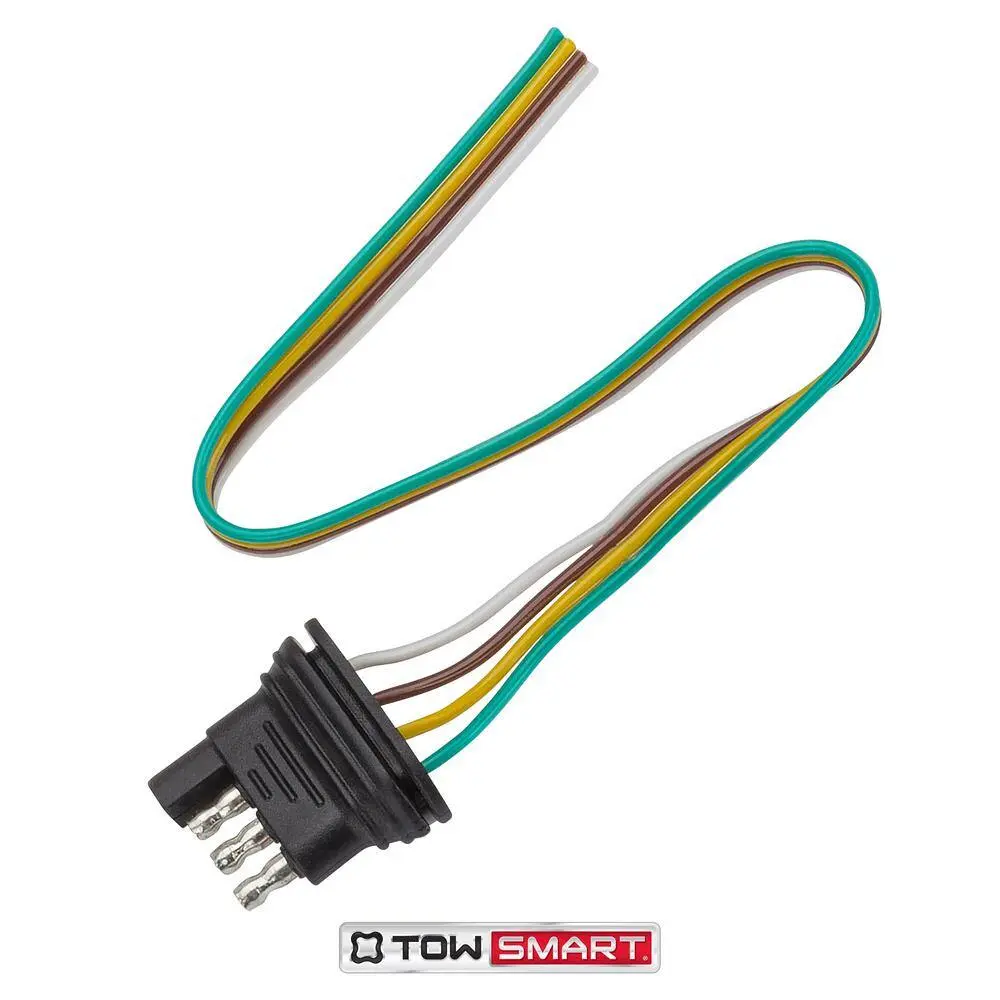 The TowSmart Electrical Connector offers a simple and efficient way to establish electrical connections between your vehicle and trailer while towing. Its one-piece design includes a 4-way flat connector (trailer end) and 12 inches of 18-gauge bonded wire for operating stop, turn, and tail lights. Made from durable, ergonomic plastic, it resists corrosion and stands up to harsh weather conditions. Ensure all functions are properly equipped for safe towing.