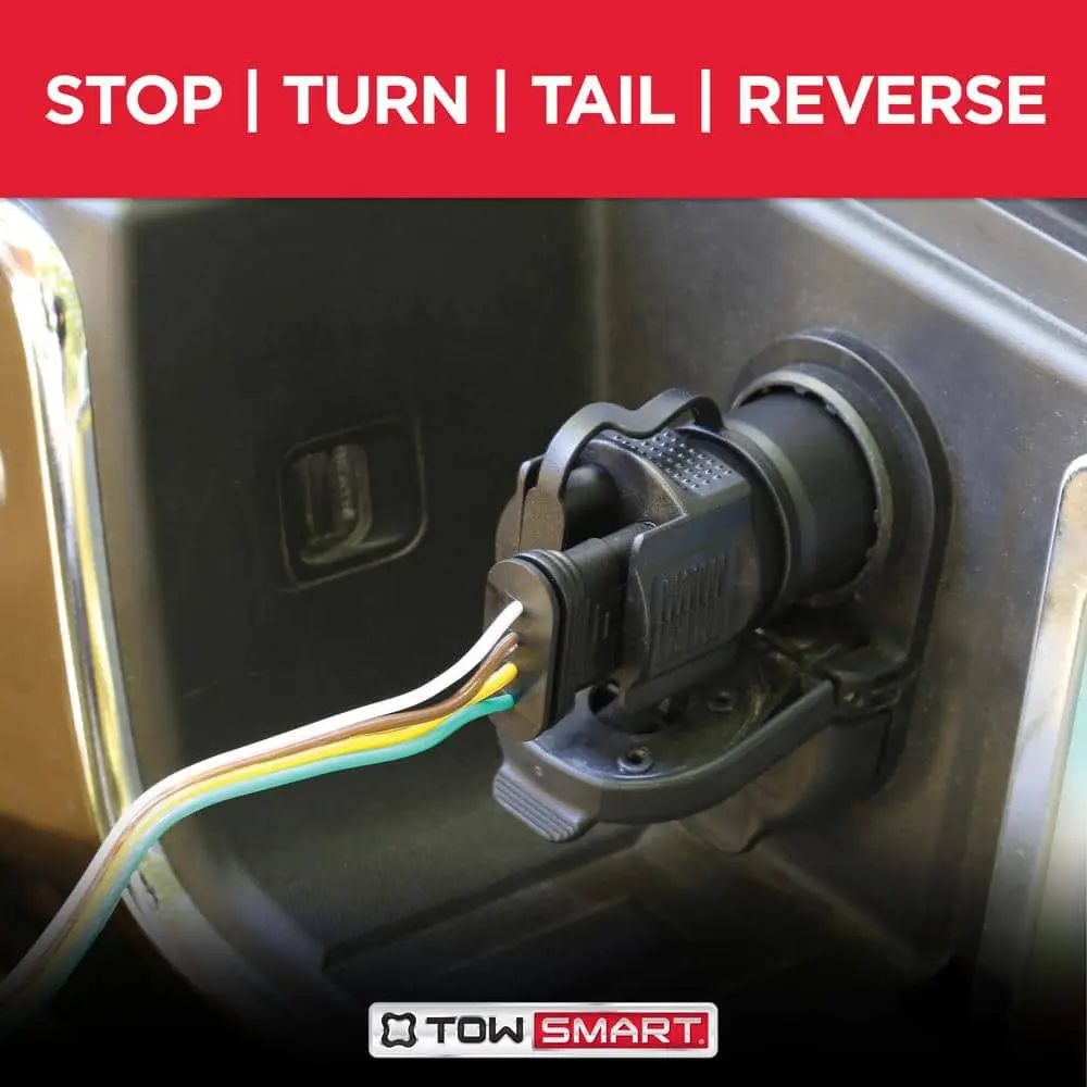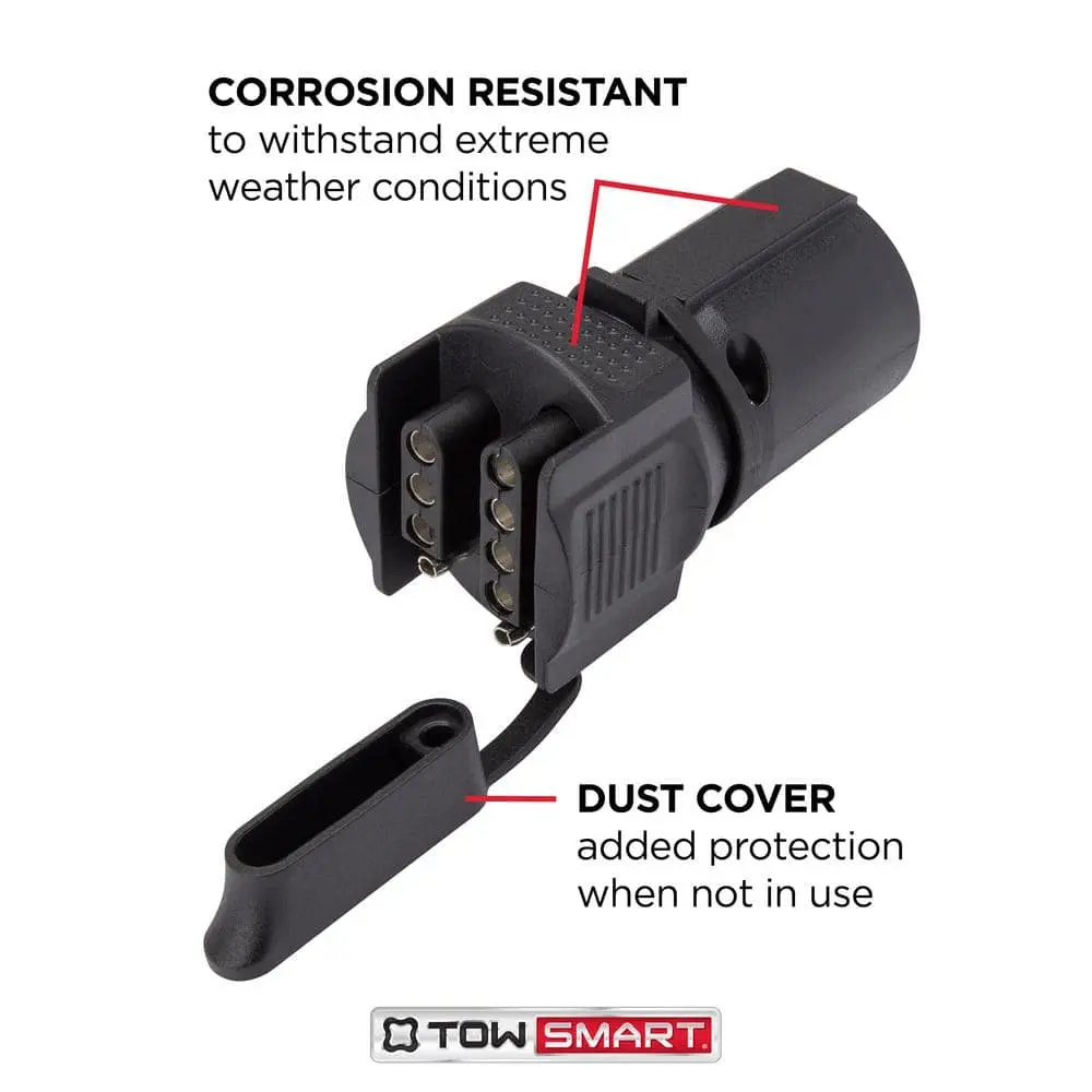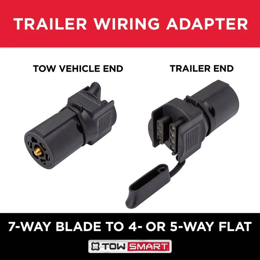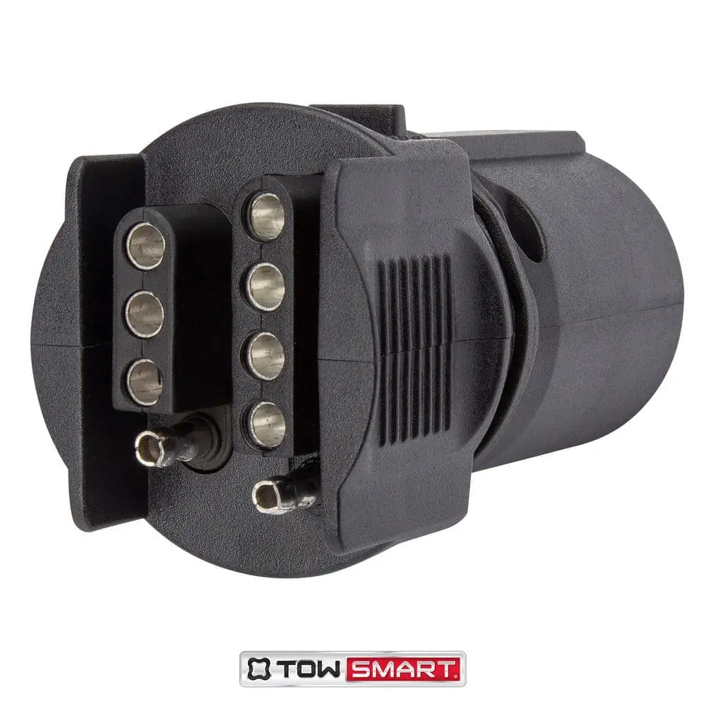 The TowSmart Electrical Adapter provides a simple and efficient solution for connecting your vehicle to a trailer with a different wiring configuration. With its single housing design, it easily plugs into your vehicle’s electrical socket without the need for additional wiring. This adapter is perfect for trailers that require a 4/5-way flat connection when your vehicle has a 7-way blade. It ensures connections for tail lights, brake lights, turn signals, and reverse lights. Built with durable, corrosion-resistant plastic, it withstands tough weather conditions for reliable performance.