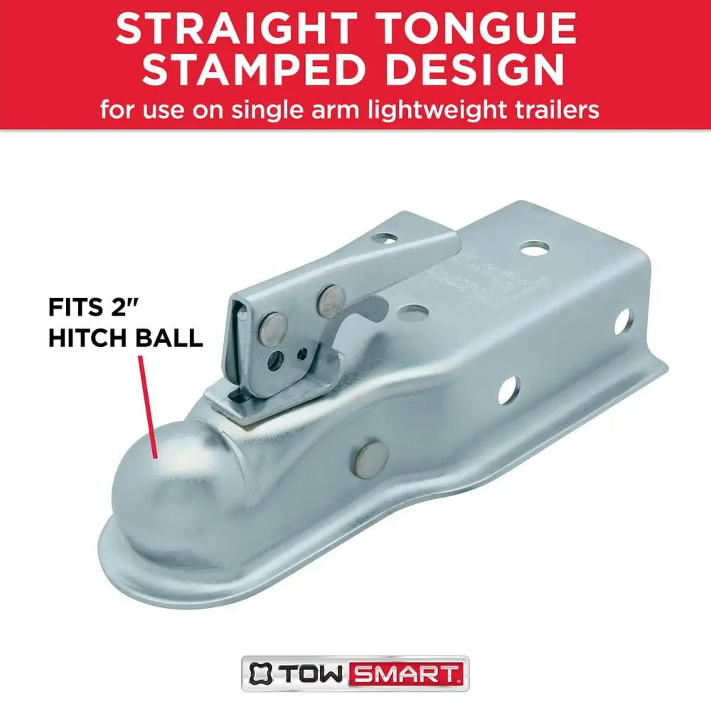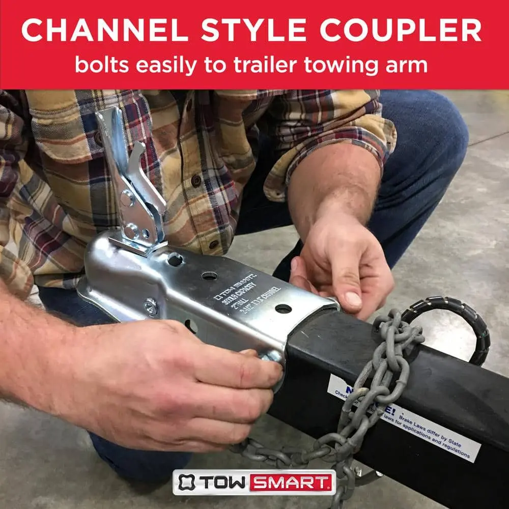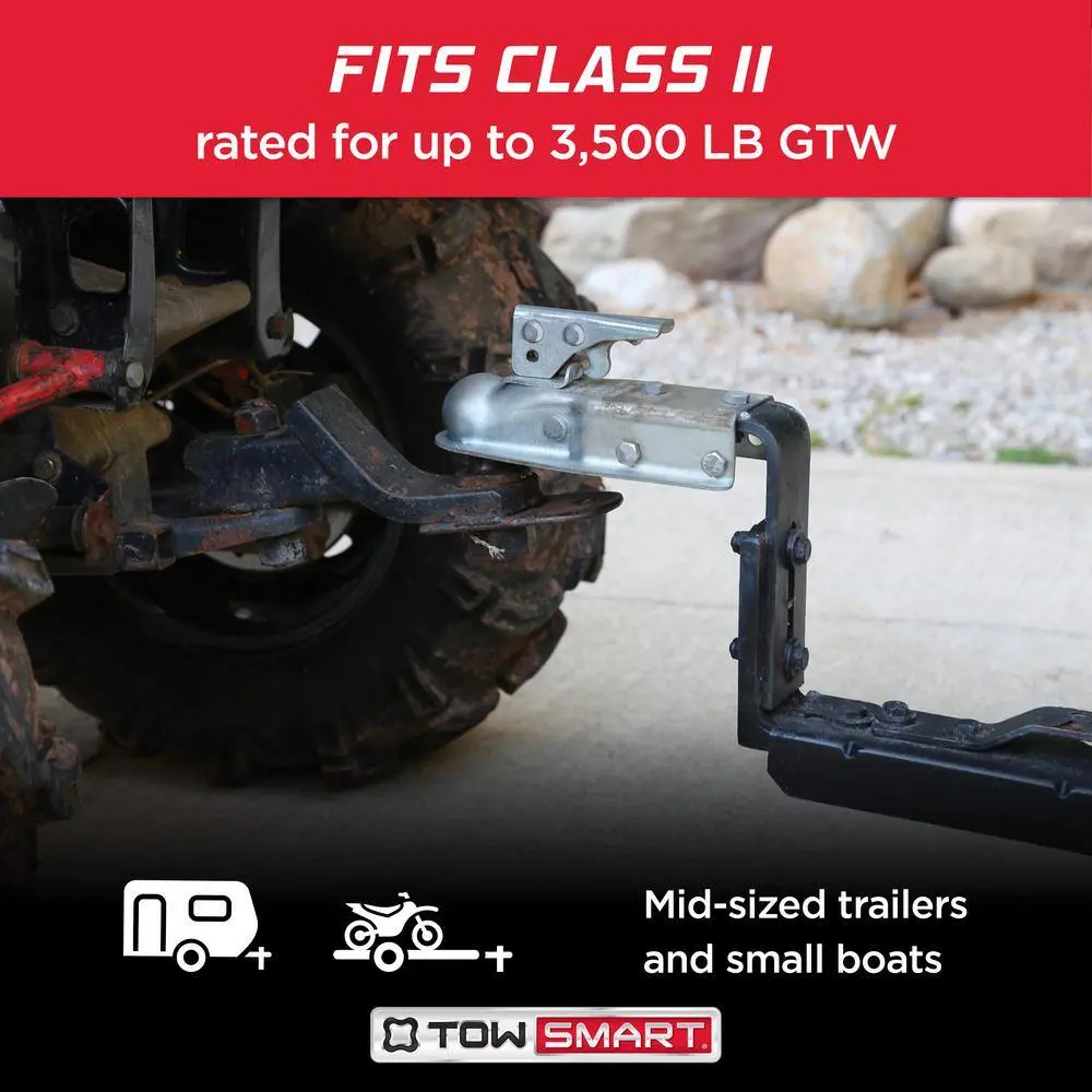 The TowSmart Class II Coupler is designed for secure and reliable towing, fitting a 2 in. hitch ball with adjustable collars to accommodate 2-1/2 in. or 3 in. channel widths. Its durable zinc-plated finish provides excellent resistance against rust and corrosion, ensuring long-lasting performance. Supports a maximum trailer weight of 3,500 lbs.