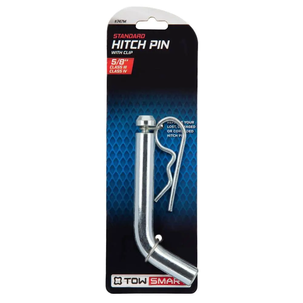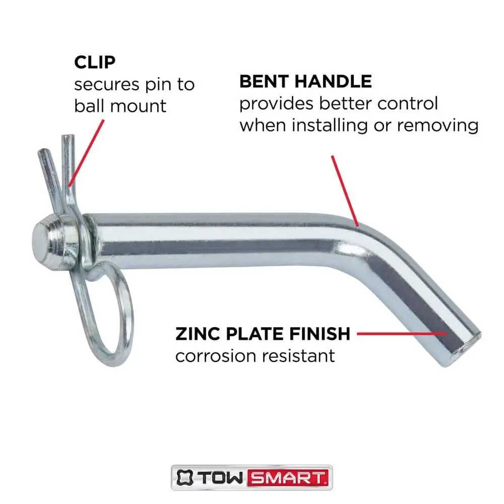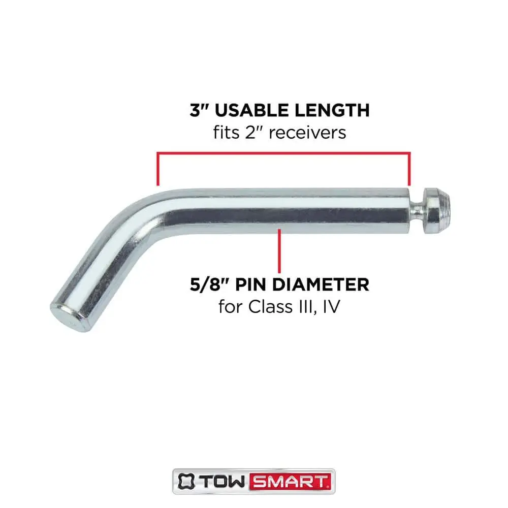 The TowSmart 5/8 in. Standard Bent Pin offers reliable protection for your boats, campers, trailers, equipment, and other valuable assets by securing your ball mount or hitch accessories to the receiver hitch. Simply insert the pin into the fastener hole after positioning your ball mount or hitch accessory in the receiver. This pin is ideal for replacing lost, damaged, or corroded hitch pins. Made from corrosion-resistant materials, it ensures a tight, secure fit and is built to withstand harsh weather conditions. This product is not recommended for long-term use on vehicles.