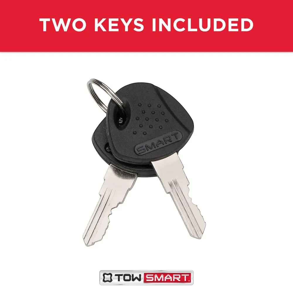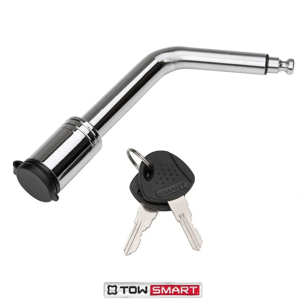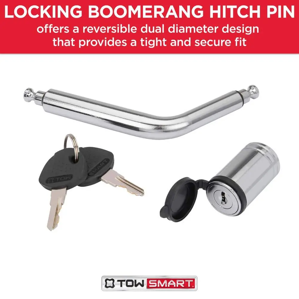 The TowSmart Boomerang Hitch Pin offers reliable security for boats, campers, trailers, and other valuable assets by preventing theft. This innovative hitch pin secures ball mounts or hitch accessories to the receiver hitch. Its patented reversible design accommodates both 1/2 in. and 5/8 in. receivers for versatile use. Made from corrosion-resistant materials with a durable chrome-plated finish, it withstands harsh weather conditions. A weather-resistant dust cap shields the locking mechanism from dirt and moisture. Includes two keys for added convenience. Not recommended for long-term use on vehicles.