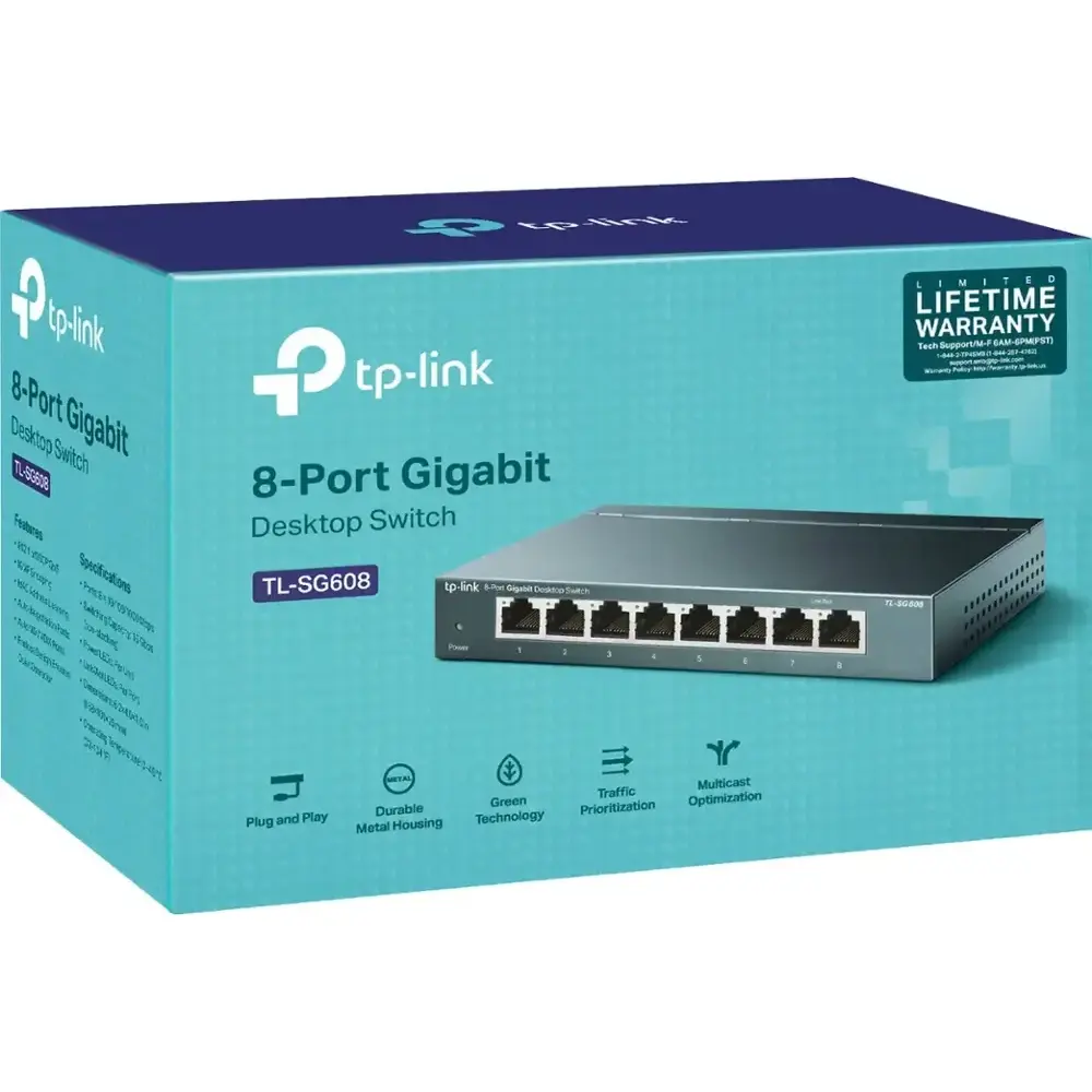 Boost the reliability and efficiency of your network with the TL-SG608 8-Port Gigabit Desktop Switch. Designed to expand your connectivity, this switch features 8x non-blocking gigabit ports, enabling instant data transfers of large, bandwidth-intensive files without interference.