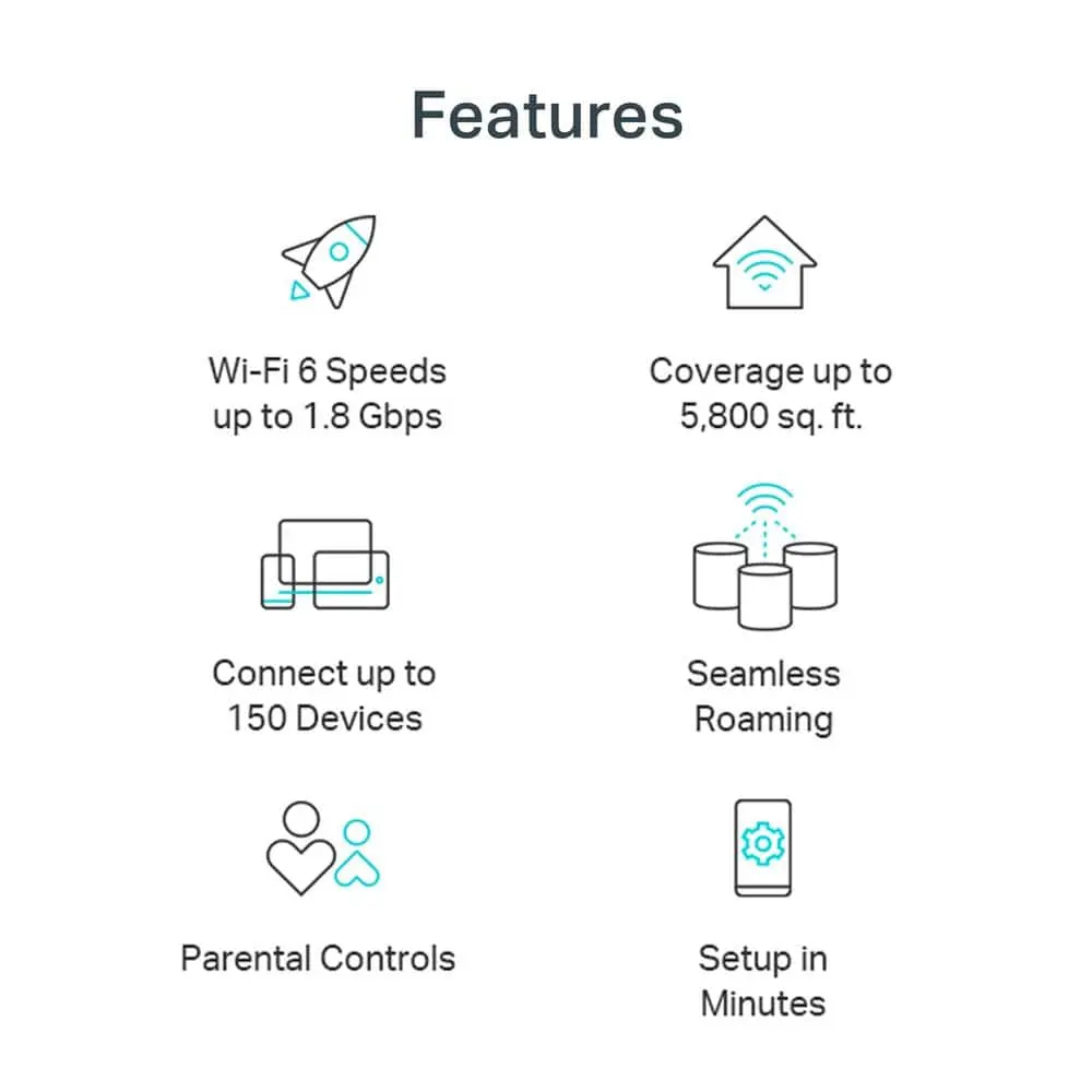 • Whole-Home Coverage: 3 Deco units provide coverage up to 5,800 sq. ft., supporting up to 150 devices. Additional units can expand coverage seamlessly.