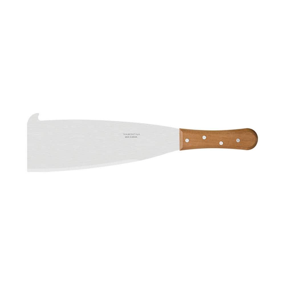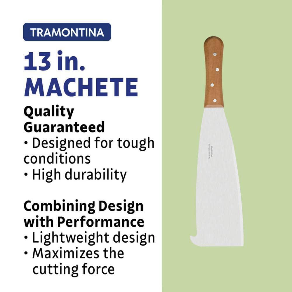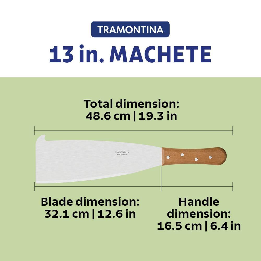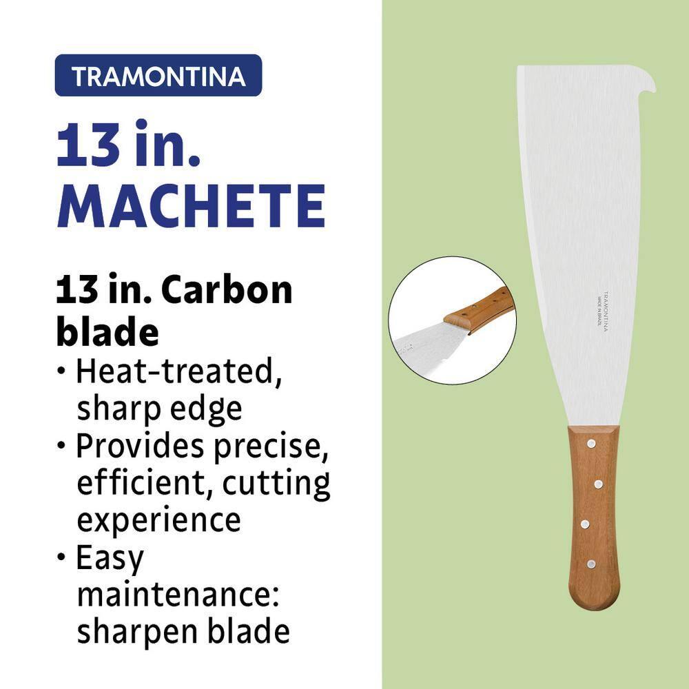 The 13 in. Sugar Cane Machete is a versatile tool designed for precision and stability in cutting sugar cane, vine, and brush. Featuring a heat-treated carbon steel blade known for its sharpness and durability, it ensures powerful, efficient cuts. The blade is further protected with a varnish coating for enhanced strength. Its natural wood handle offers both sturdiness and comfort, with an ergonomic design that provides a secure grip for full control during use. Bound with aluminum rivets, the handle is built to withstand tough conditions and ensure long-lasting durability. The machete's blunt tip allows for precise cutting, while the handy hook at the blade's end helps you easily pull cut cane, streamlining your work. Whether you're clearing small areas or tackling larger tasks, this machete is built to handle the challenge with ease.