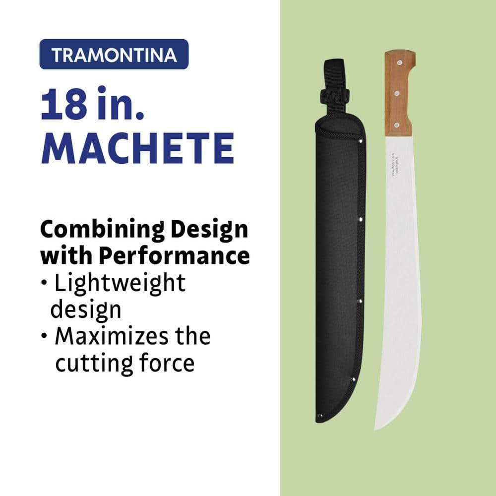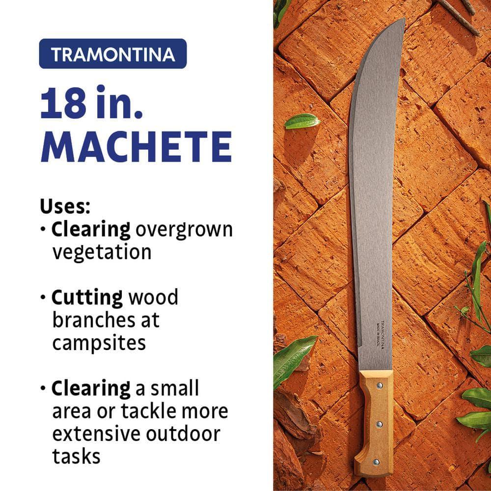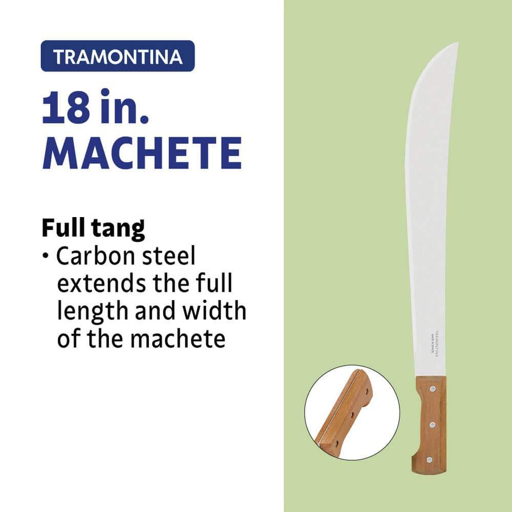 Elevate Your Yard Work with the Tramontina 18 in. Machete, designed for exceptional performance in all your outdoor tasks. Featuring a robust carbon steel blade and a comfortable wood handle, this machete is built to handle your toughest yard maintenance and utility needs with ease. The machete boasts a full tang blade for superior strength and balance, complemented by an ergonomic design for comfortable handling. The 18-inch heat-treated carbon steel blade, coated with a protective varnish, ensures impressive cutting power and long-lasting durability. Experience unmatched sharpness and resilience as you tackle your yard work, making the Tramontina machete an indispensable tool in your outdoor arsenal.