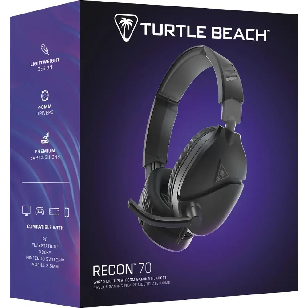 The Turtle Beach Recon 70 Multiplatform Gaming Headset offers exceptional versatility and comfort for gamers, compatible with PC, PS5, PS4, Xbox Series X|S, Xbox One, and mobile devices. Featuring 40mm speakers, it delivers immersive, high-fidelity audio for an enhanced gaming experience. The headset's lightweight design ensures comfort during long sessions, while the high-sensitivity flip-to-mute mic ensures clear communication with teammates. Built for durability, it has a robust construction that stands up to extended use. Convenient on-ear controls allow quick adjustments to volume and mic settings, and the premium ear cushions provide lasting comfort for hours of play