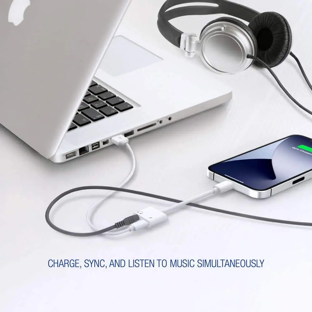 The Tzumi 2-in-1 Adapter lets you charge, sync, and listen to music or audio simultaneously. Simply plug it into your iPhone and connect your charger and AUX headphones for seamless use. No more choosing between charging and enjoying your favorite tunes—this adapter has you covered!