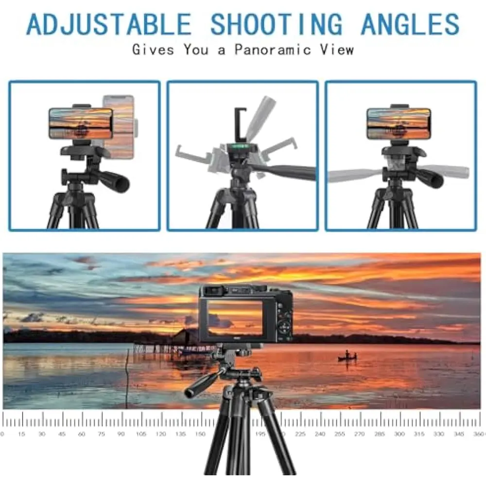 The UEGOGO 62" Phone Tripod is a versatile and lightweight solution for capturing photos, videos, and live streams. With a maximum height of 142 cm (62"), it is compatible with a variety of devices including iPhones (15/14/13/12/11 series), GoPro, DSLR cameras, and more. It supports a load capacity of up to 4.5 lbs, making it suitable for various setups. The tripod features a pan head for smooth adjustments, and comes with a remote control for hands-free operation. Its portable design, made from aluminum and plastic, ensures durability and easy transport. Ideal for vlogging, selfies, and video recording.