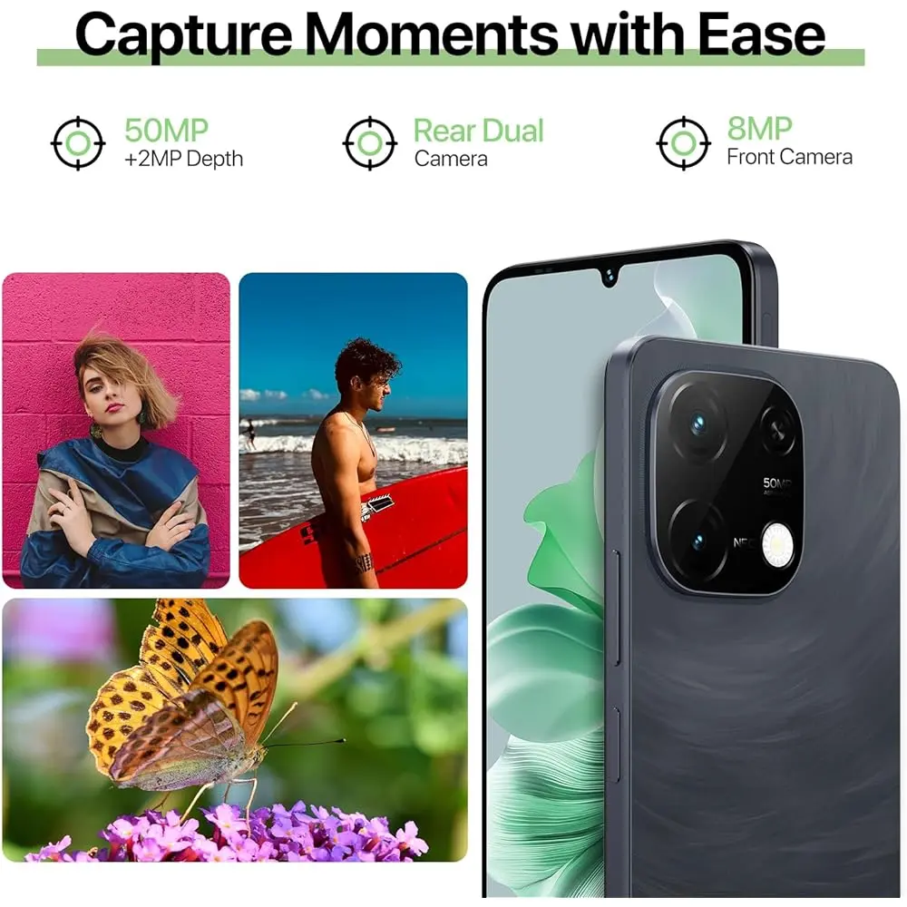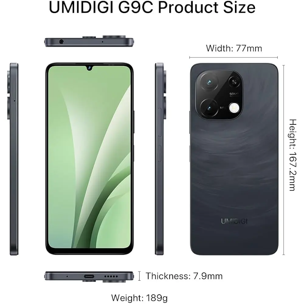 The UMIDIGI G9C Android 14 Unlocked Smartphone offers powerful performance with 12GB of RAM and 128GB of storage (expandable up to 1TB). Equipped with an Octa-core MediaTek Helio G36 processor, it ensures smooth multitasking and gaming. The 6.75-inch HD+ display with a 90Hz refresh rate delivers vibrant, fluid visuals. Capture sharp photos with the 50MP rear camera and enjoy clear video calls with the 8MP front camera. With a 5000mAh battery, this phone provides all-day power. The device features Wi-Fi 2.4G/5G, Bluetooth 5.4, NFC, and AI Face Unlock for enhanced security and convenience. It also supports dual SIM.