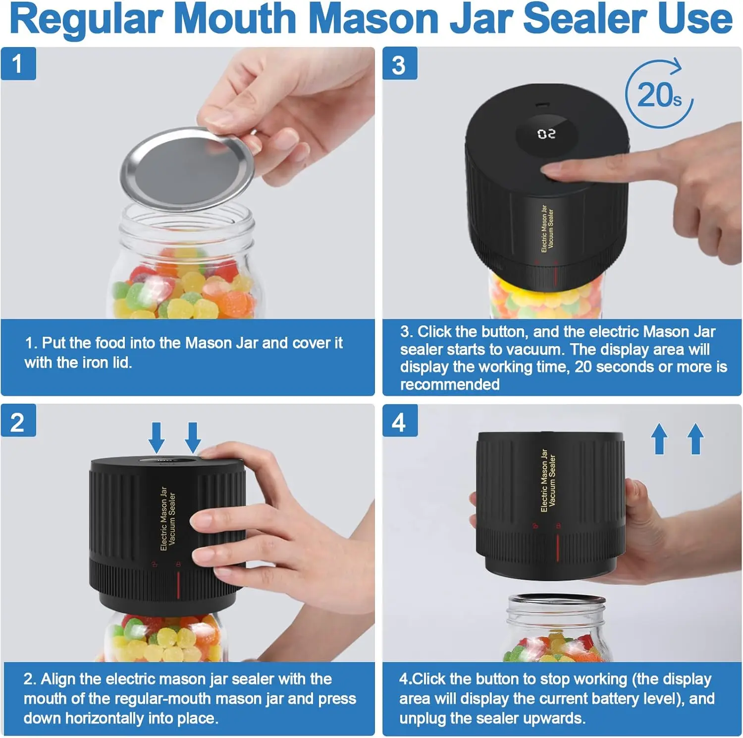 Versatile Mason Jar SealerThis electric vacuum sealer is compatible with both standard and wide-mouth Mason jars. For standard jars, simply align the red arrow with the unlock symbol on the main unit, insert it into the silicone ring, and tighten until the arrow points to the lock symbol.Complete Sealing KitThe kit includes an electric vacuum sealer, a wide mouth sealer, a standard mouth converter, 5 wide mouth Mason jar lids, 5 regular mouth lids, and a user guide, helping you effectively remove air and prolong food freshness.User-Friendly DesignThis cordless vacuum sealer works with both jar sizes (jars not included). Ensure its centered on the lid, press the button to start the vacuum process, and wait about 40 seconds for a secure seal. Pressing the button again will close the sealer.Effortless OperationForget manual pumps! With our electric vacuum pump, just press a button and wait 40 seconds to achieve a vacuum seal, minimizing clutter and effort.Portable SolutionNo vacuum sealer? No problem! This electric Mason jar sealer is compact and perfect for travel, picnics, or home use, making it easy to vacuum-seal your jars on the go.