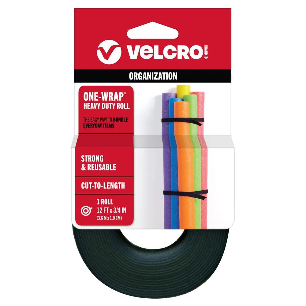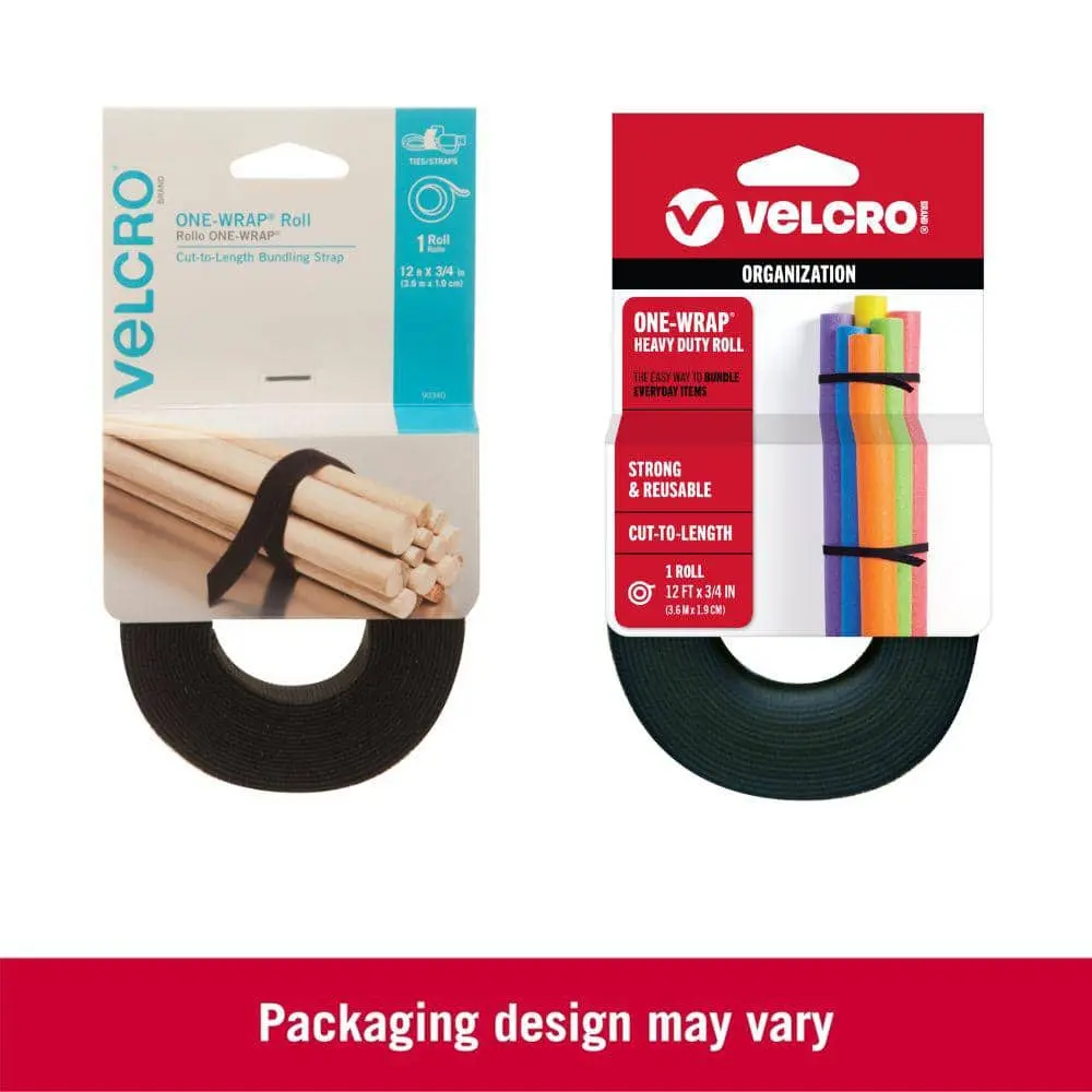 The VELCRO 12 ft. x 3/4 in. One-Wrap Strap offers a 12 ft. x 3/4 in. size, providing ample length for various applications. Its one-wrap design is easily adjustable and reusable, making it a convenient solution for organizing. Built to be strong and durable, it securely holds cables, cords, and other items in place. The cut-to-length feature allows customization for different needs, ensuring a perfect fit every time. With its versatile use, this strap is ideal for organizing wires, gardening, and a wide range of DIY projects