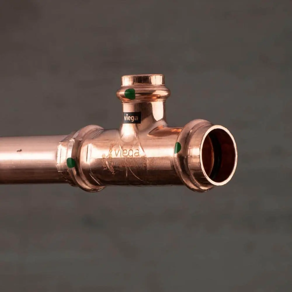 The Viega ProPress copper reducing tee offers a reliable way to connect copper tubes, designed for use with ASTM B88 and B75 copper tubing. These reducing tees provide a seamless transition between different-sized tubes. Installation is fast and simple, requiring no calibration, flame, or heavy equipment. With just four easy steps—cutting the copper tube to length, removing burrs and surface imperfections, measuring and marking the fitting insertion depth, and using a press tool—this copper reducing tee ensures a secure connection. Viega's Smart Connect technology detects unpressed connections during pressure testing, ensuring reliable connections from the start and preventing callbacks. Viega ProPress copper reducing tees meet the highest industry standards and are the preferred choice for professionals worldwide.