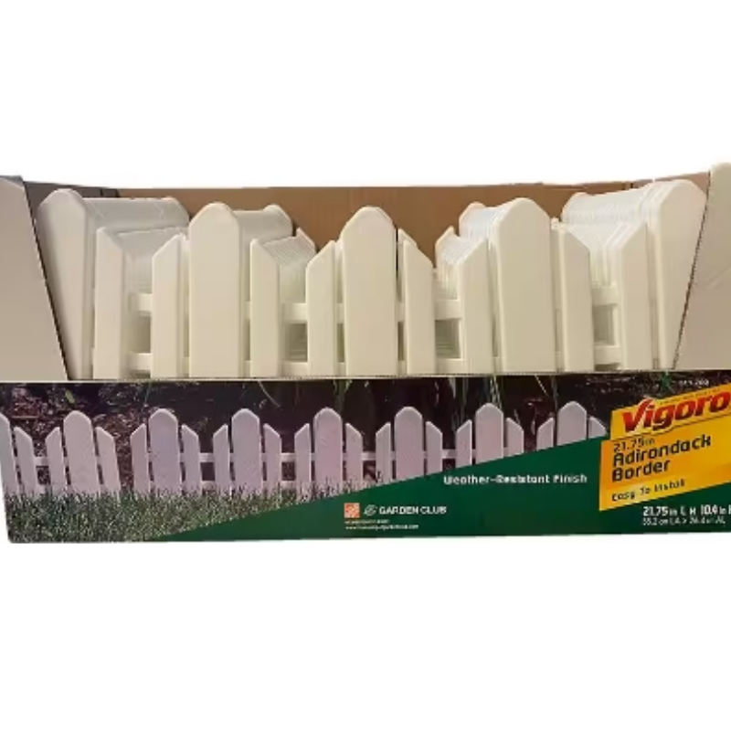 The Vigoro 22 in. W x 11 in. H Plastic White Adirondack Decorative Border Landscape Edging combines functionality with aesthetic appeal to enhance garden and landscape design. Features: Dimensions: Measures 22 inches in width and 11 inches in height, providing a significant visual impact while defining garden borders. Material: Made from durable plastic, designed to withstand outdoor conditions and resist weathering. The material is lightweight yet sturdy. Color: Comes in a classic white color, which adds a clean, elegant touch to garden edges and complements various landscaping themes. Design: Features an Adirondack-style pattern, offering a decorative touch that mimics traditional wooden border designs. The design adds a charming and refined look to garden beds and pathways. Installation: Easy to install with simple interlocking or staking methods. The lightweight plastic makes handling and placement straightforward. Maintenance: Low maintenance compared to wood or metal edging. The plastic material is resistant to rust, rot, and fading, ensuring a long-lasting appearance. This decorative border edging is ideal for creating attractive and well-defined garden and landscape edges, enhancing the visual appeal of outdoor spaces.