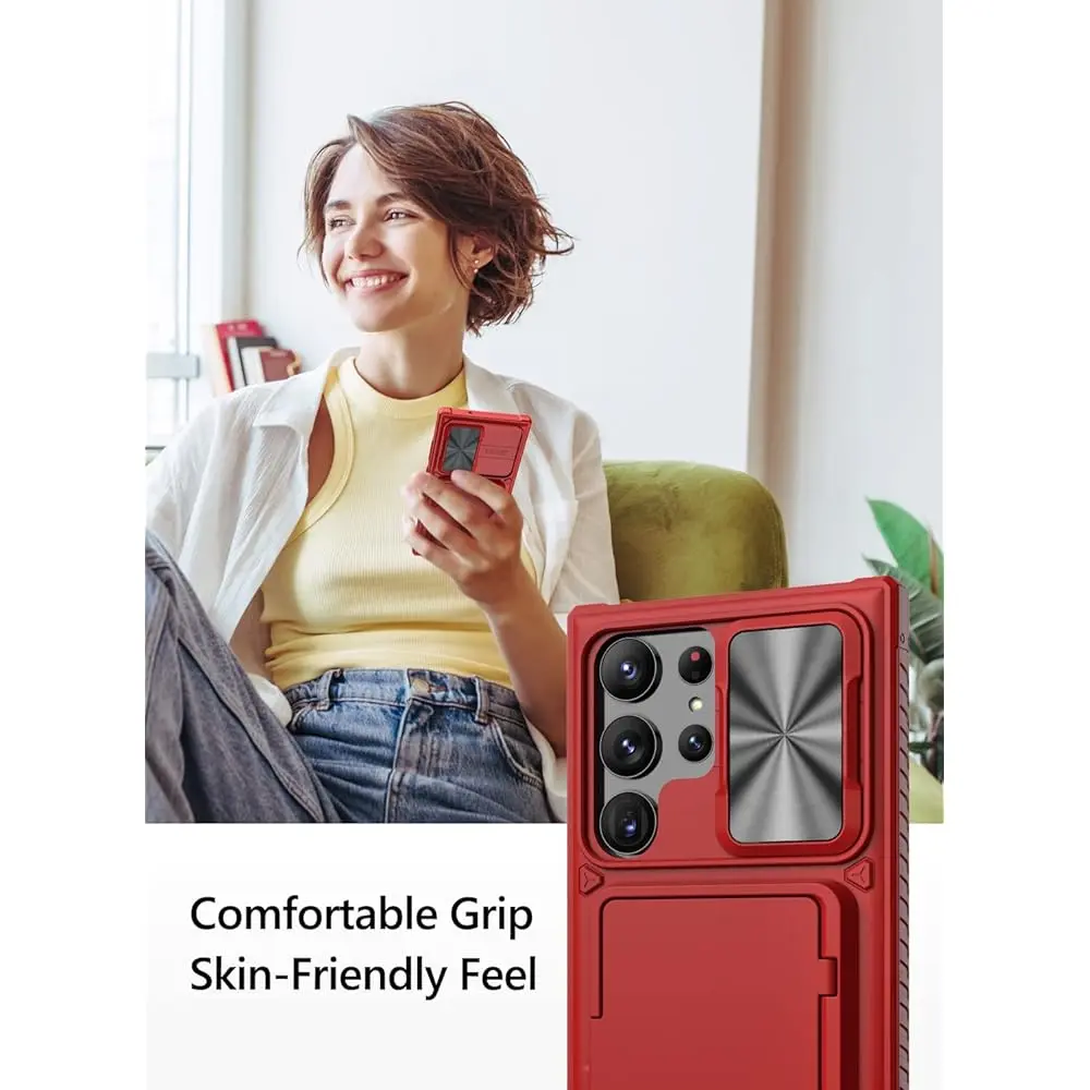 Designed with a built-in card holder, it securely stores up to 4 cards, such as credit cards or IDs, allowing you to travel light without the need for a separate wallet. The case also features a sliding camera protection cover, providing a secure barrier against scratches and damage while maintaining privacy.