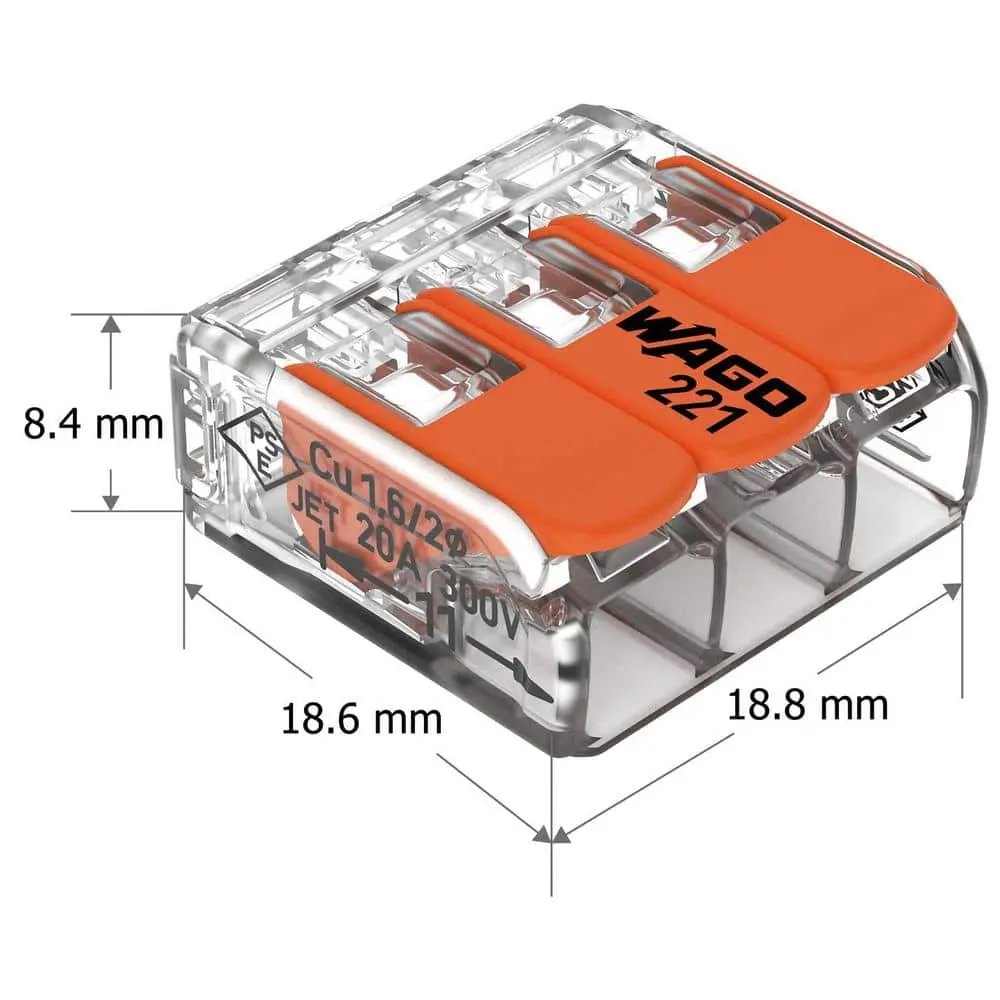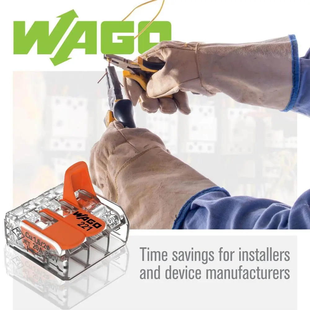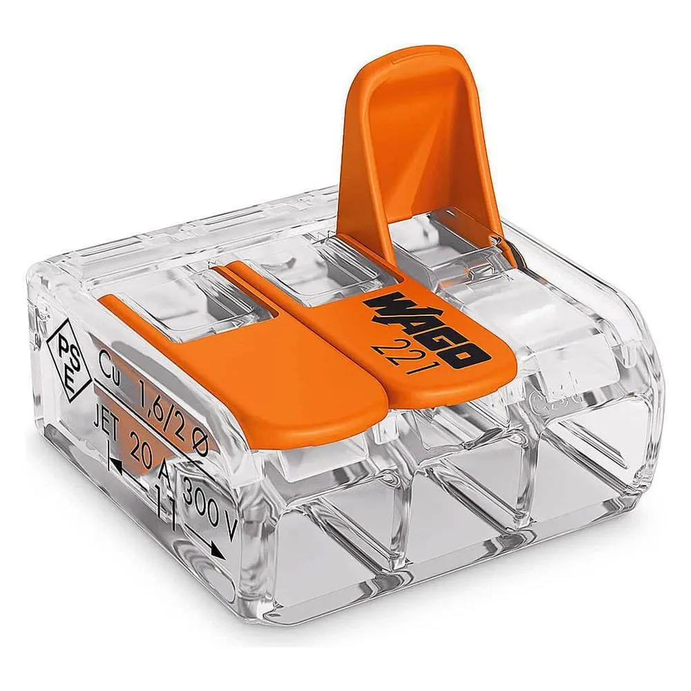 WAGO's 221 Series wire splicing connectors offer a tool-free, lever-actuated design for quickly and safely connecting solid, stranded, and fine-stranded conductors. These connectors are available in 2-, 3-, and 5-wire versions to accommodate wire sizes from 24-12 AWG and 20-10 AWG. The levers require minimal effort to open, making conductor connections fast and easy. Recessed handles ensure a secure grip during use. Additionally, voltage testing is accessible from either side of the connector, even when installed. Flexible mounting carriers can be mounted vertically or horizontally on a DIN-rail or smooth surfaces for easy installation and removal. The design complies with VDE standards for added safety.