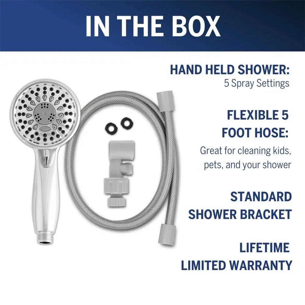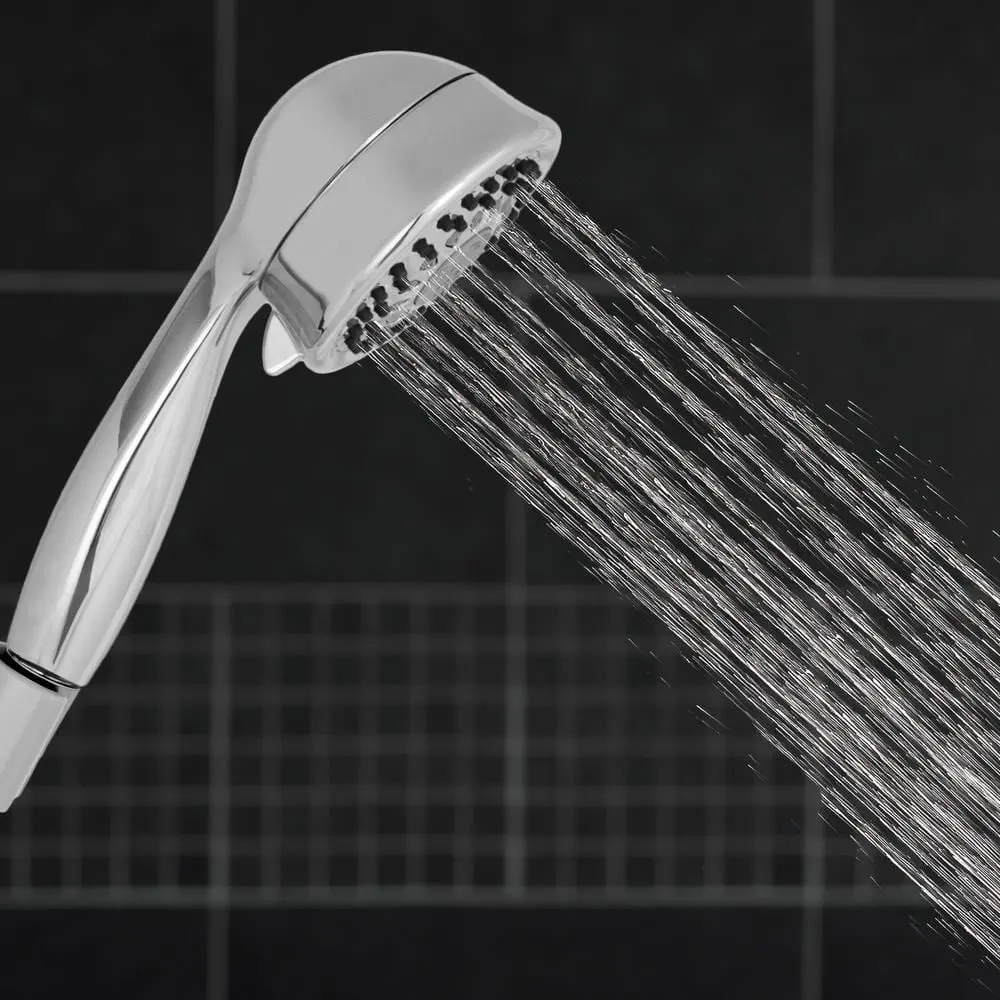 The Waterpik Vardon 5-Spray Handshower in Chrome offers a tailored showering experience with five spray settings. It features a convenient spray control ring for easy switching and a 5 ft. hose, making it perfect for bathing children and pets or reaching tricky spots. The easy-clean nozzles help reduce mineral and hard water buildup, promoting a cleaner bathroom environment.