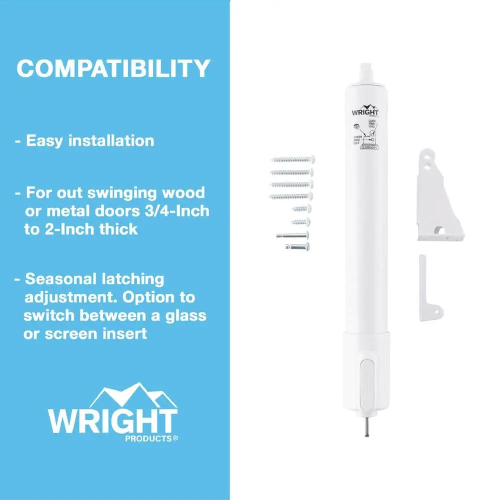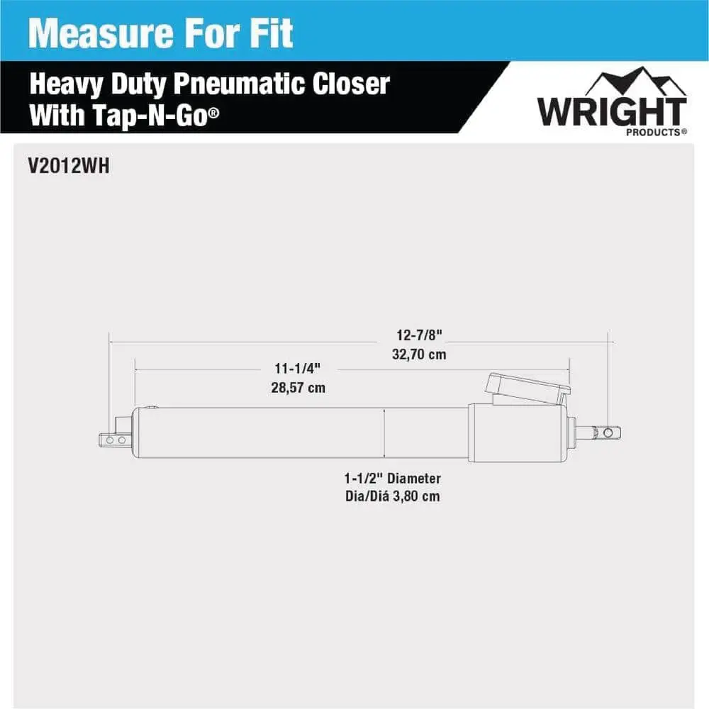 The Wright Products heavy-duty pneumatic (air pressure) door closer is designed for out-swinging medium-to-heavy weight storm, home, or security doors. Built for durability, this heavy-duty closer can handle frequent opening and closing throughout the day. The TAP-N-GO technology allows you to easily hold the door open with a simple tap of a button.