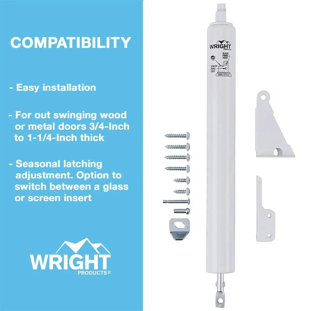 The Wright Products standard-duty pneumatic (air pressure) door closer is designed for out-swinging, light-to-medium weight storm, home, or security doors. For lighter to medium-weight doors, a single closer is sufficient, while two closers (one on top and one at the bottom) are recommended for heavier storm and screen doors. Built to last, this closer can withstand frequent use, ensuring durability with repeated opening and closing.