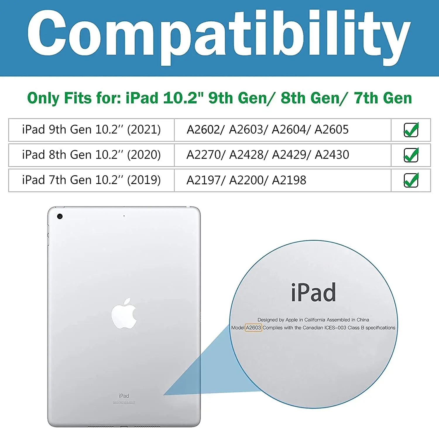 • Compatibility: Fits iPad 9th (2021), iPad 8th (2020), iPad 7th (2019) Generation (10.2-inch models), including models A2602, A2603, A2604, A2605, A2270, A2428, A2429, A2430, A2197, A2198, A2200.