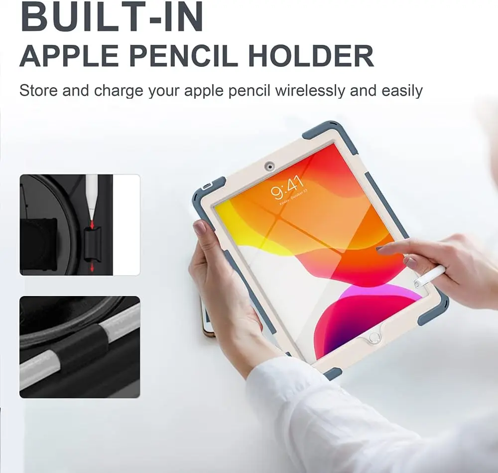 The ZenRich Rugged Shockproof Case offers robust protection and convenience for your iPad 9th, 8th, or 7th Generation (10.2-inch models). Built for durability and functionality, this case features a 360-degree rotating kickstand, a built-in pencil holder, an adjustable hand strap, and a detachable shoulder strap for easy carrying. The 3-layer design with a silicone outer frame and reinforced inner shell ensures maximum protection, making it ideal for kids and adults alike.