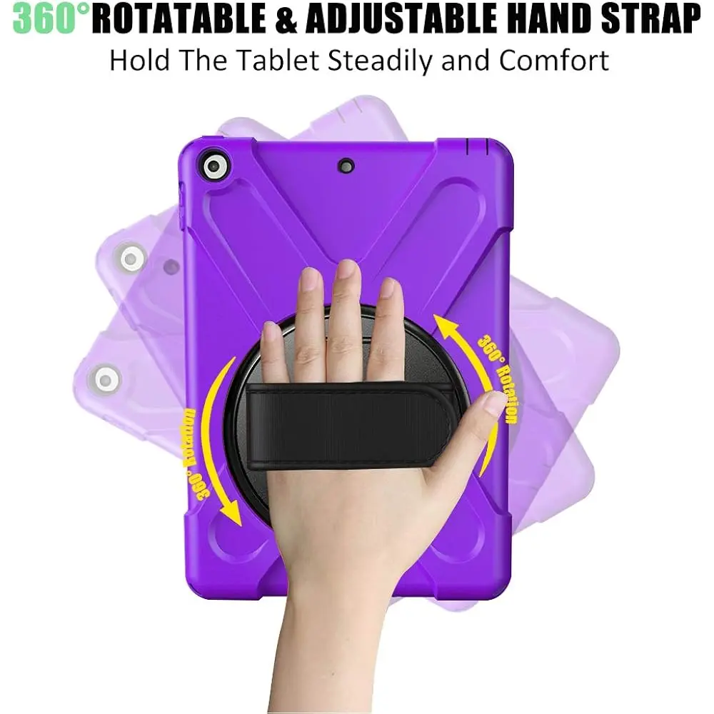 ZenRich Rugged Shockproof Case for iPad 9th/8th/7th Generation 10.2 inch (2021), with Pencil Holder, Rotating Hand Strap, Stand, Shoulder Strap, and Screen Protector (A-Purple)