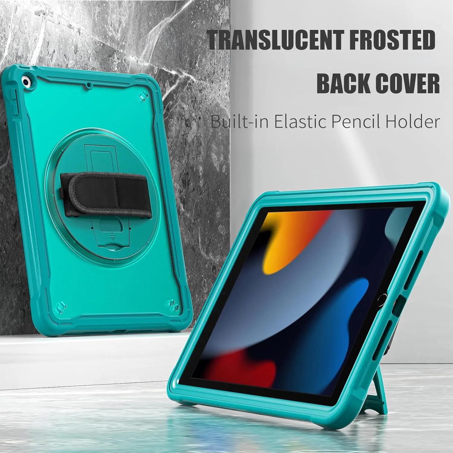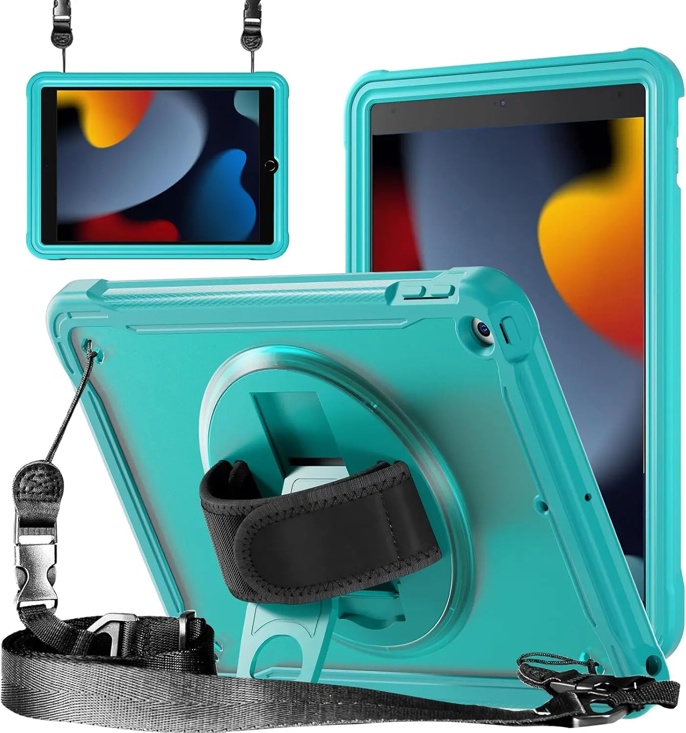 ZenRich Rugged Shockproof Case for iPad 9th/8th/7th Generation 10.2 inch (2021), with Pencil Holder, Rotating Hand Strap, Stand, Shoulder Strap, and Screen Protector (B-Light Blue)