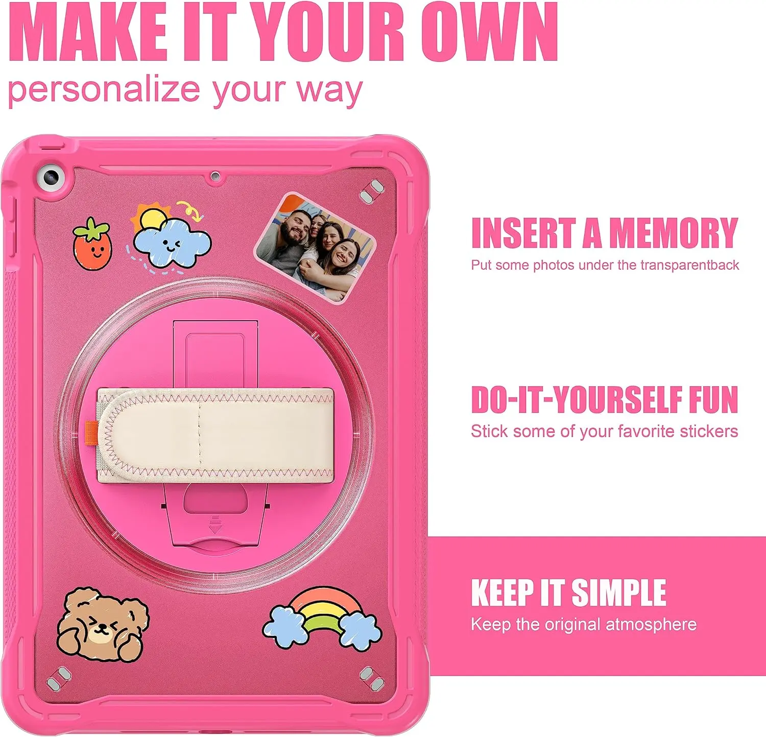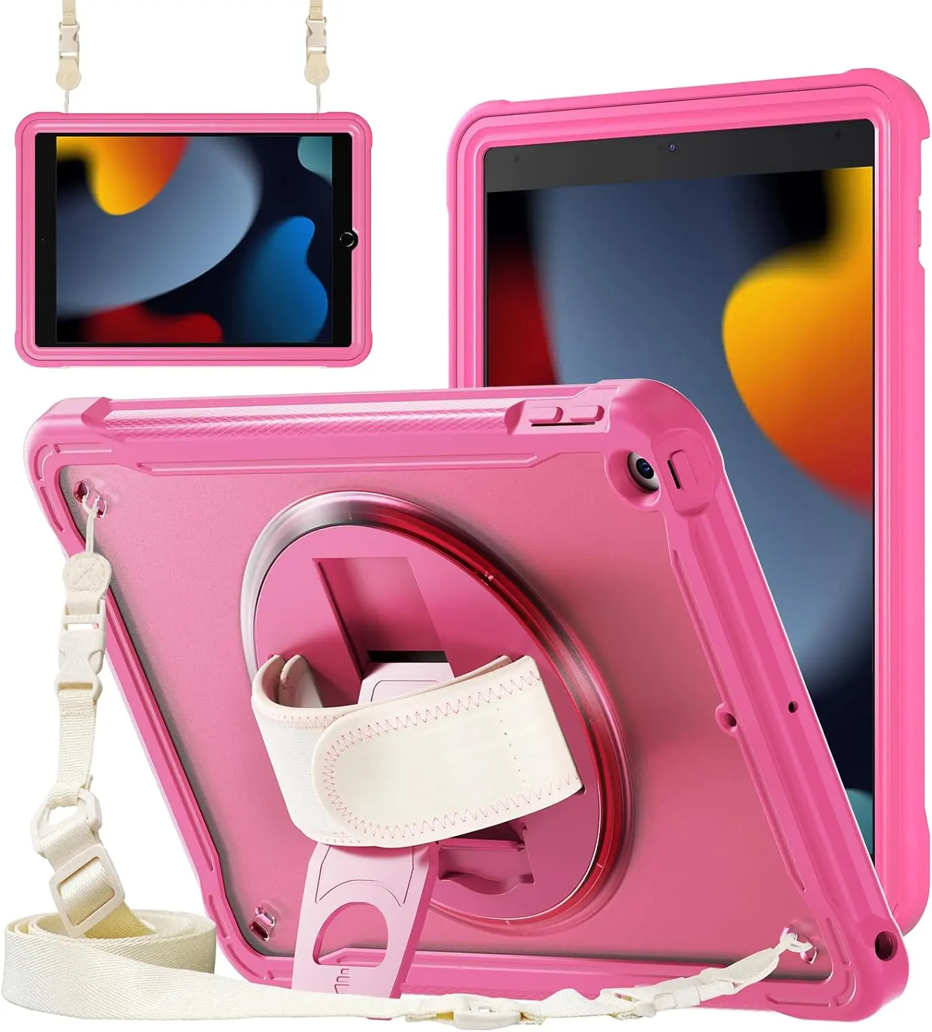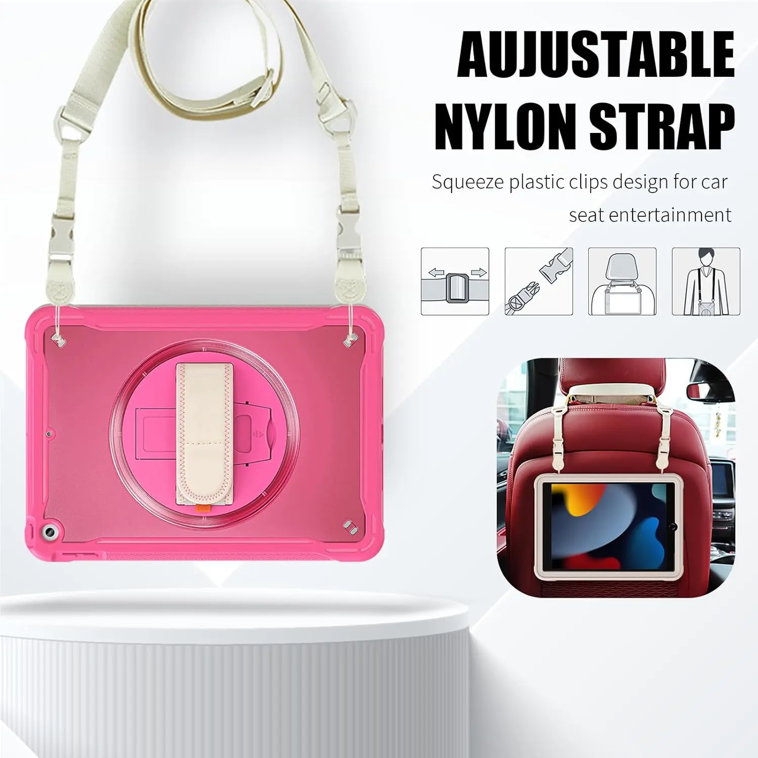 ZenRich Rugged Shockproof Case for iPad 9th/8th/7th Generation 10.2 inch (2021), with Pencil Holder, Rotating Hand Strap, Stand, Shoulder Strap, and Screen Protector (B-Rose)