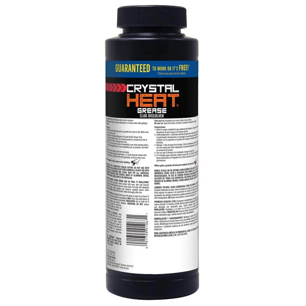 ZEP Commercial Crystal Heat Drain Opener is specially formulated to tackle tough clogs by generating heat that melts blockages. It effectively eliminates grease, soap scum, and hair on contact. This powerful drain cleaner is safe for all types of pipes and septic systems, making it ideal for use in kitchen and bathroom sinks. To use, first remove any standing water from the sink or tub and ensure the drain water is cool. Then, slowly pour one heaping tablespoon of Crystal Heat Drain Opener directly into the drain, being careful not to let the product touch any surfaces or fixtures. Next, add one cup of cold water and cover the drain with a bowl, leaving a slight gap to prevent pressure buildup. Once the drain is cleared, flush with cold water. If the drain remains clogged, repeat the process until it clears.